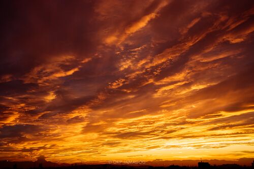 リビングに凄い色の光が差し込んでる!と外を見たら空が爆焼けしていました。咄嗟に車で多摩川の是政橋あたりまで走ることも考えましたが、既に日没時間を過ぎていたのでカメラ(SEL1635Zを付けたα7)を持って急いでマンションの上階へ… ここまで見事に焼け…