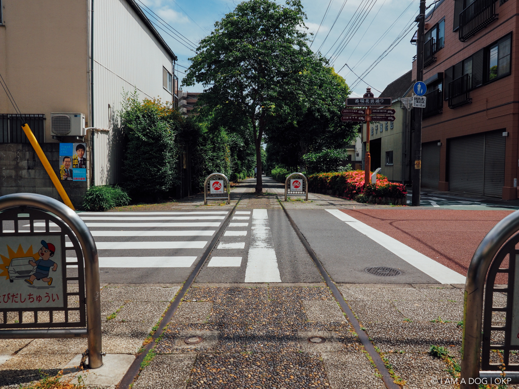 (追記)東京競馬場西門前のおけら街道。府中街道の歩道の柵で塞がれてしまっているこちら側へ伸びる道は、東京競馬場前駅があった頃の名残なのですね。不思議な角度である道だと思っていましたがなるほど。