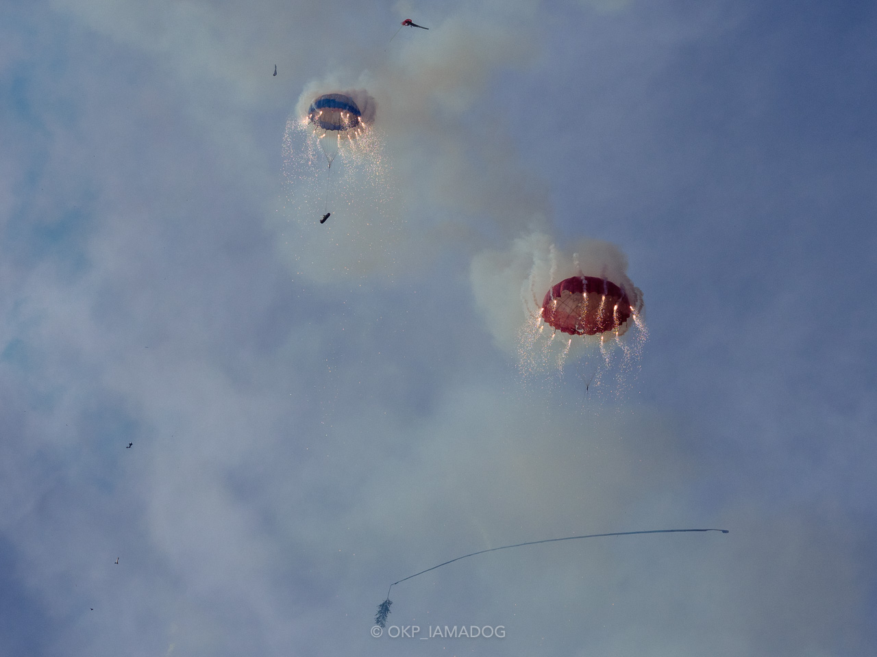 さて、この龍勢。天高く飛んでいけば成功、という訳ではありません。まずは白煙を噴き上げ、昇り龍の如く天高く昇っていくのが第一段階。そこから落下傘が開き、矢柄を吊りさげ、同時に煙幕や花火を煌めかせながら、ゆっくりと矢柄が降りてきて大成功!なのです。