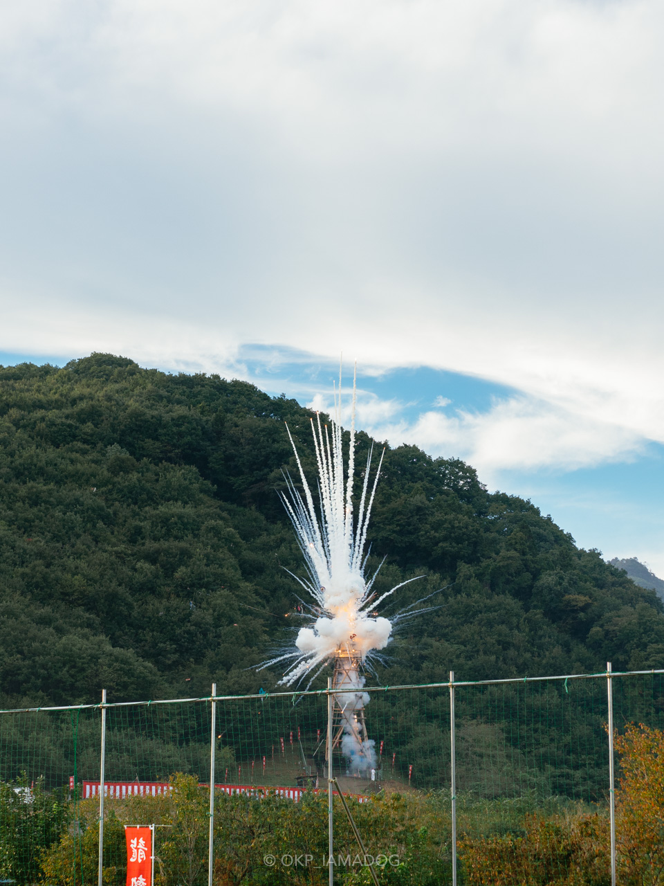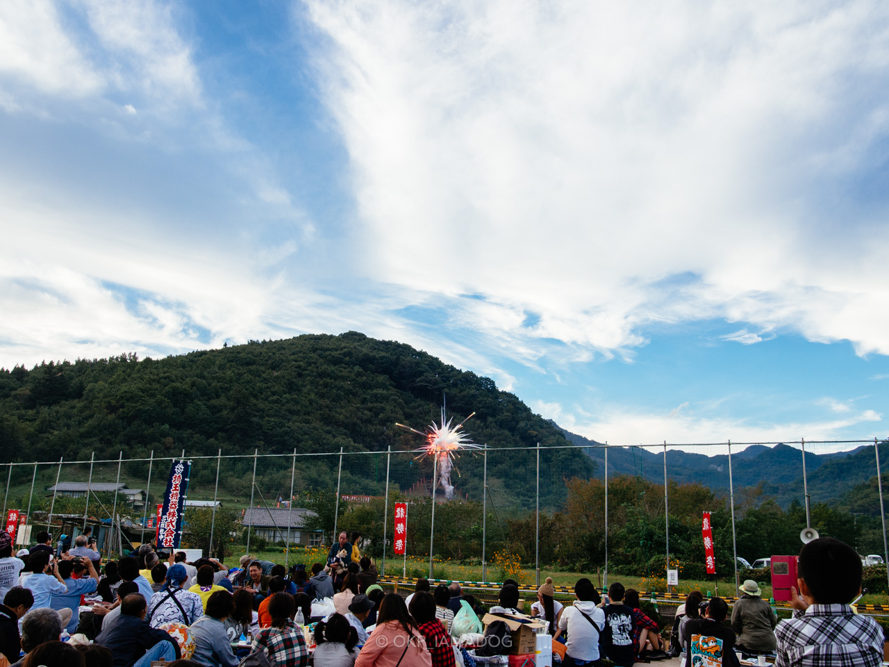 龍勢が打ち上がるのは安全のために立ち入りが制限された、柵の向こうにある龍勢櫓(発射台)から。望遠レンズを使っていますが、実際には100m以上の距離が離れています。