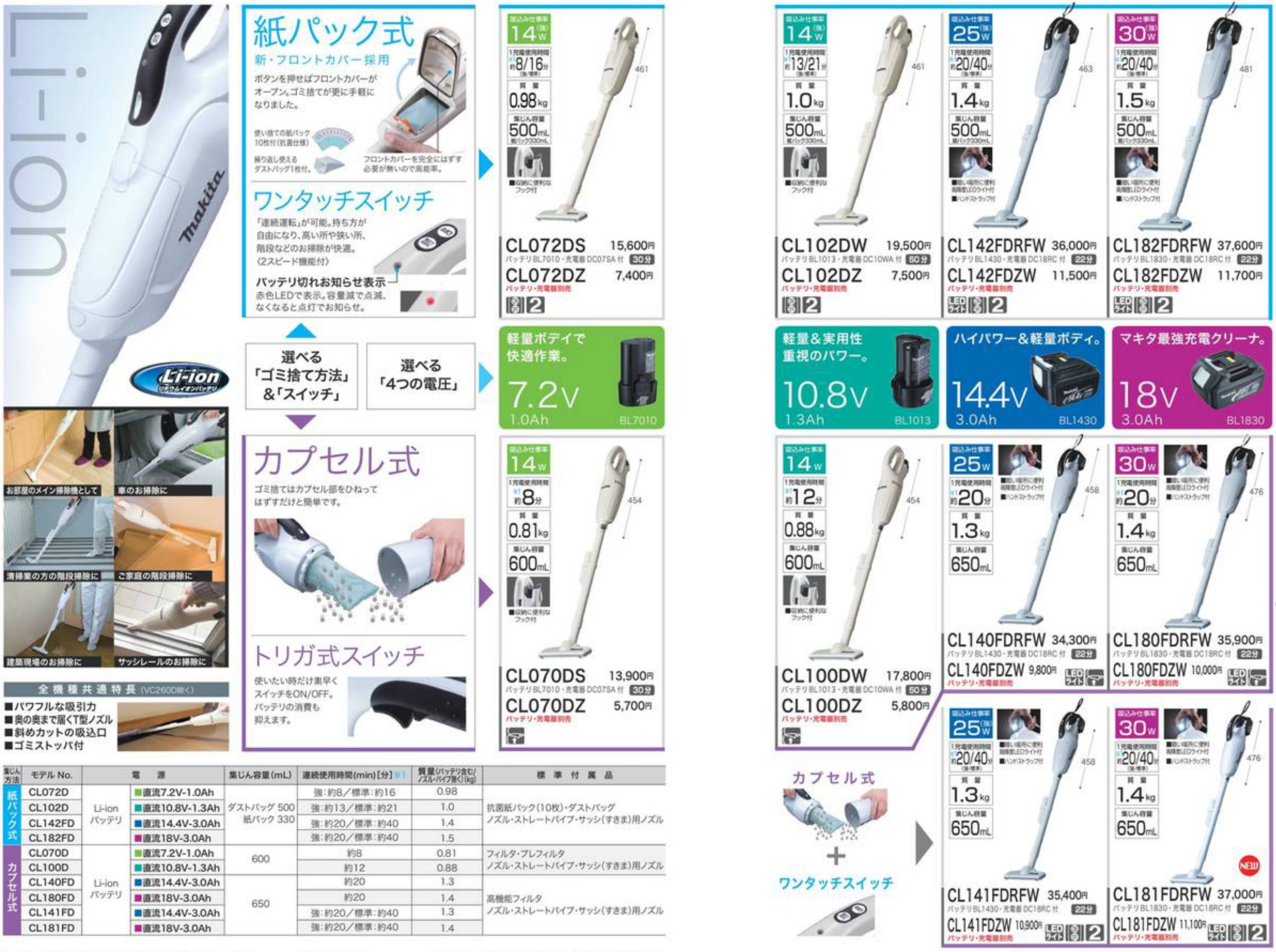ちなみにセパレート型のバッテリーは型番が合えば、電動ドリルや充電式コーヒーメーカーとの共有が可能。ドリル色のマキタのコーヒーメーカは気になりますね(笑) 尚、コーヒーメーカーとバッテリーが共有できるクリーナーは上位モデルの「CL182FDRFW」です。