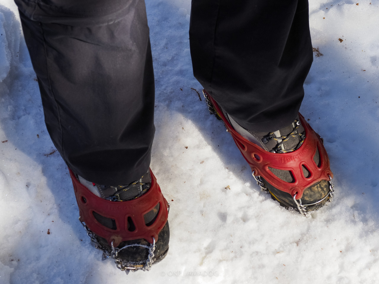 少し登り始めると登山道に雪が増えてきました。所々アイスバーン状態で斜面は滑りやすいので、早々にチェーンスパイクを着けることにしました。