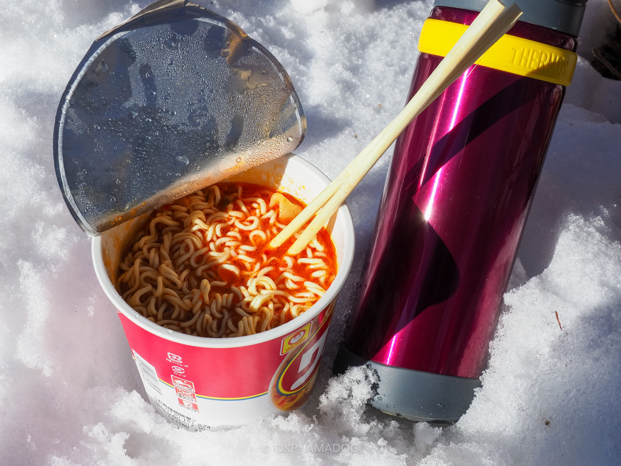 プラス30秒も余計に待てば十分食べられます。ただし写真のように雪にカップを突っ込んだりすると、どんどん冷めていくの注意。