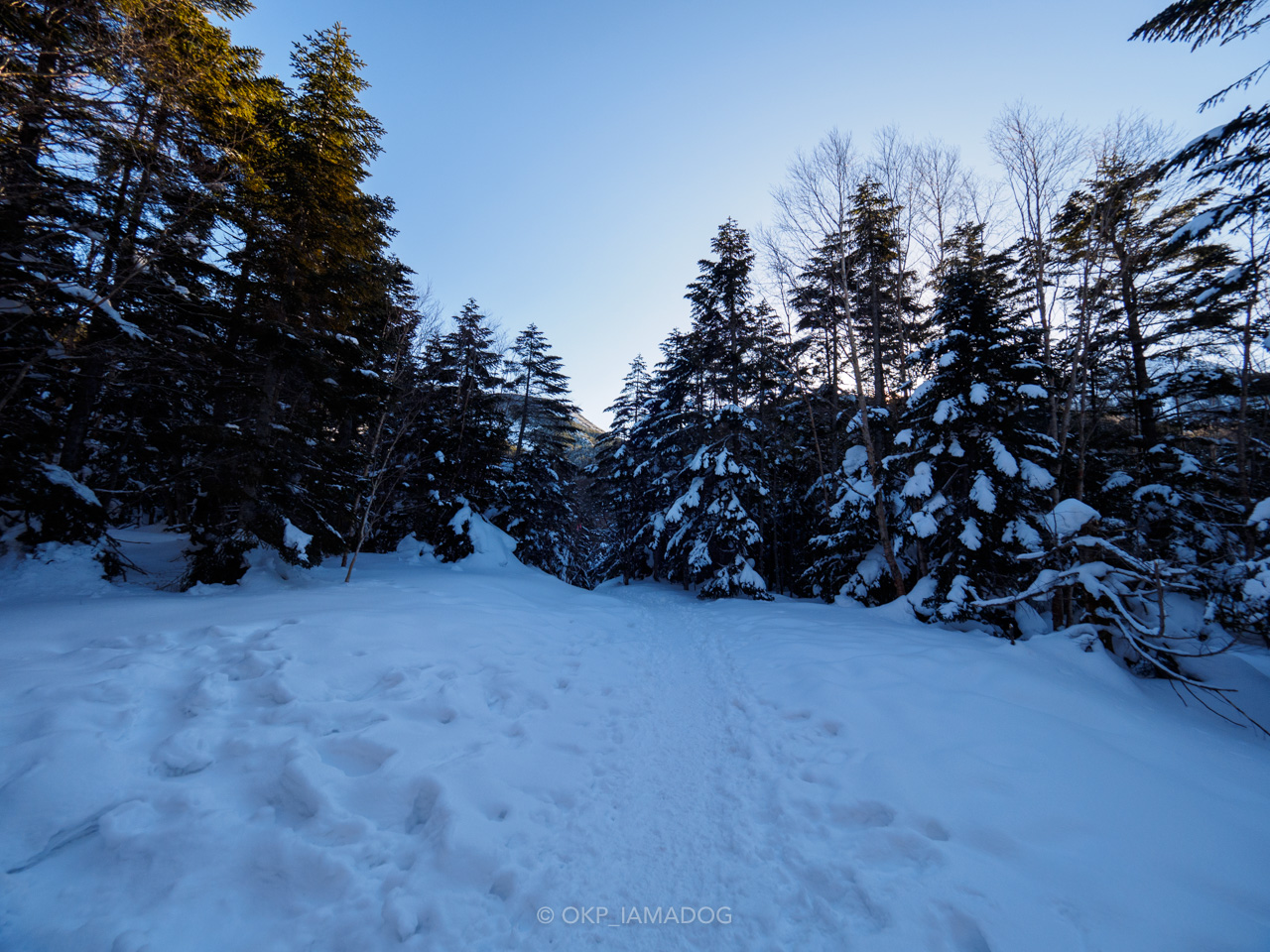 渋ノ湯登山口は標高が1800m程あるので、 始めから雪山歩きが楽しめます。標高2400mの黒百合ヒュッテまでは、あまりキツイ急登がない樹林帯歩き。アイゼンなしで行く人もいるようですが、アイゼンとは別にチェーンスパイクがあると行き帰り非常に捗ります。