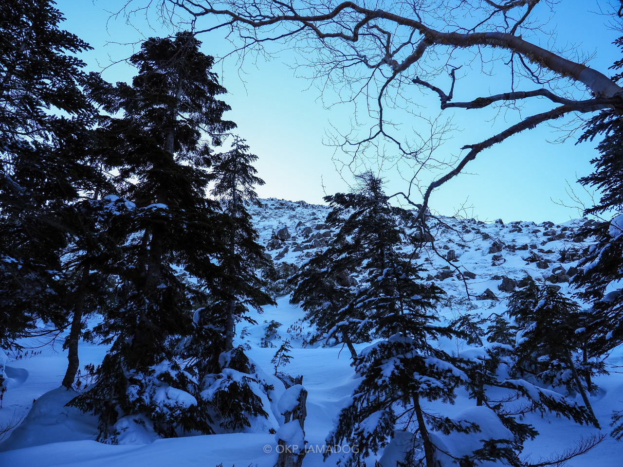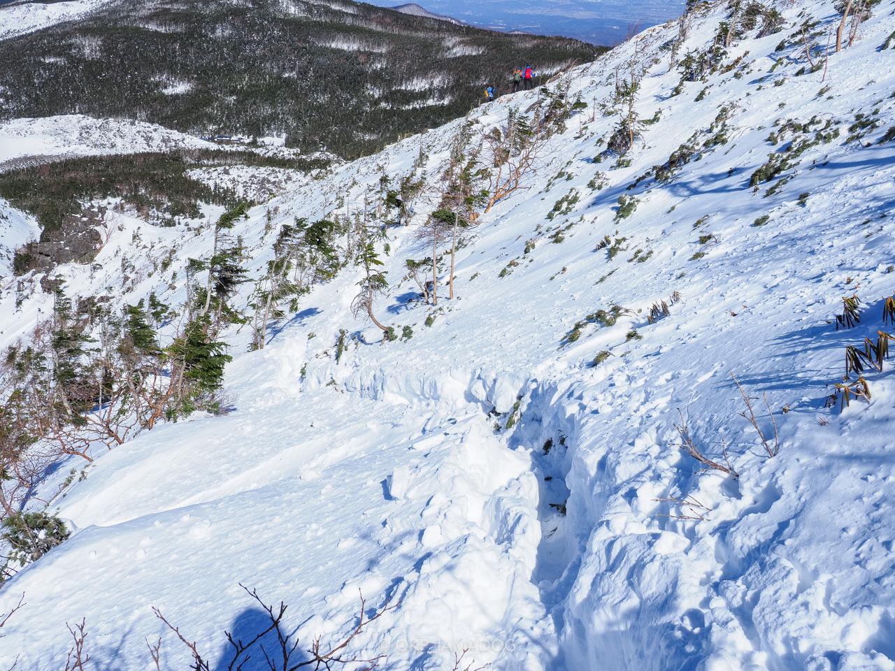 こちらの斜面はトレースが随分と深いですね。登りとは同じ稜線上なのですが、少し離れた「天狗の奥庭」と呼ばれる大きな岩の多いエリアに抜けていきます。