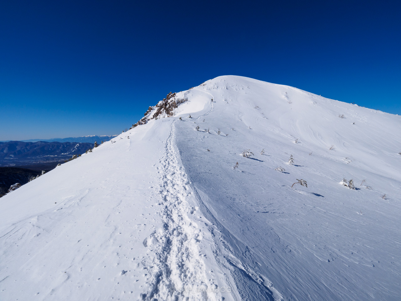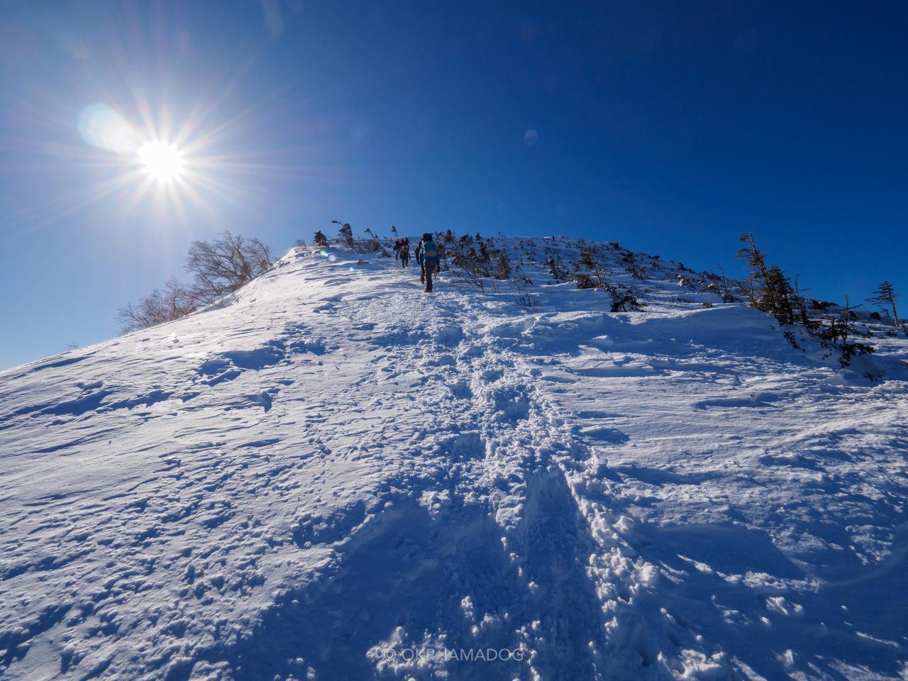 東天狗岳への最後の登り。人気の山なのでトレースはしっかり付いていますが、風が当たる斜面はかなり雪が固くなってるので、うっかり転んだりしないよう気を付けて登ります。
