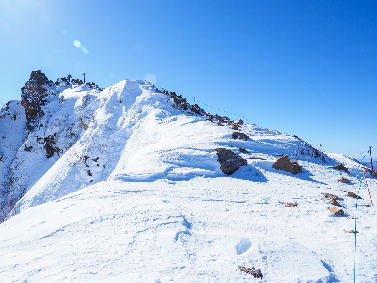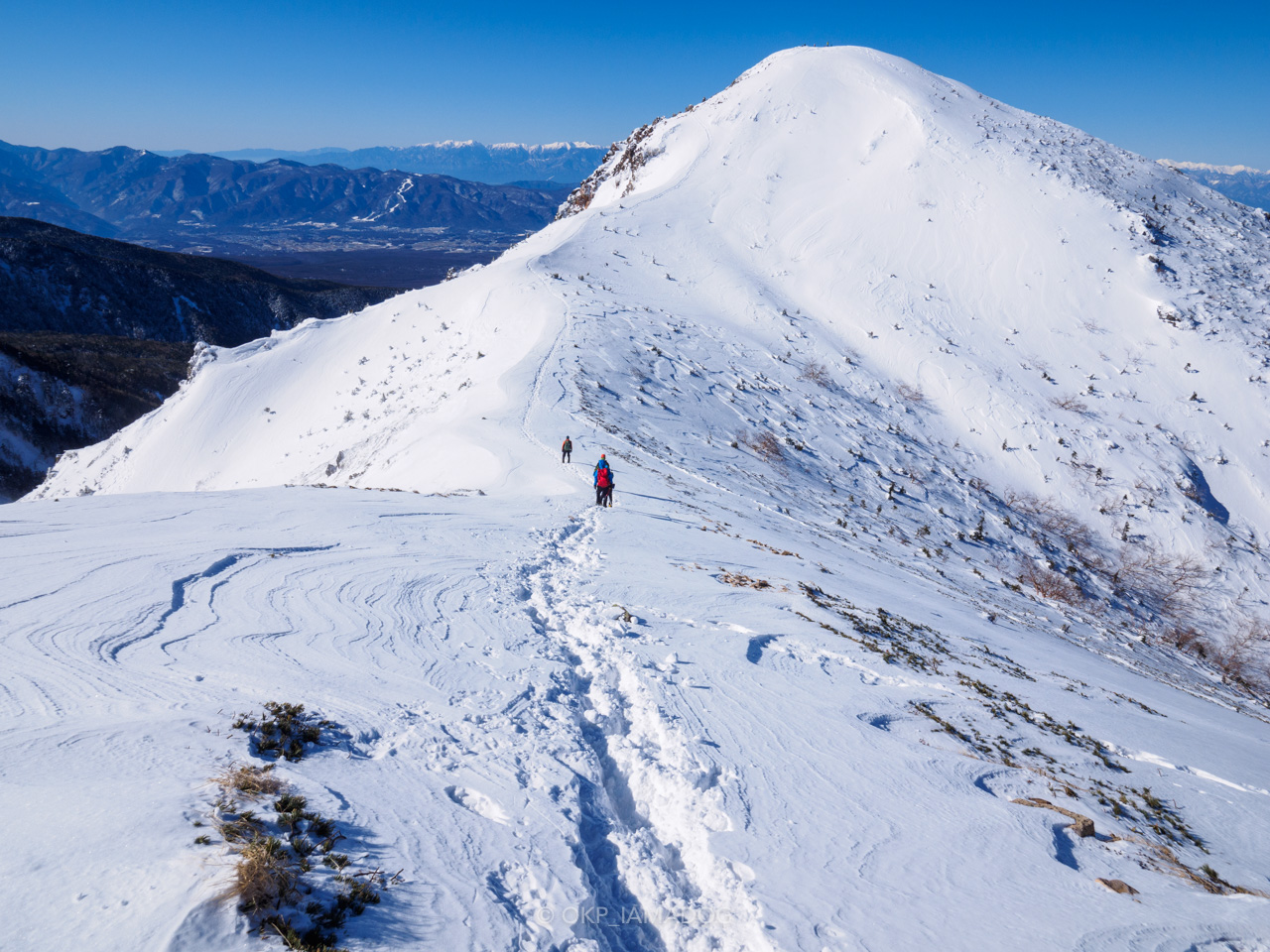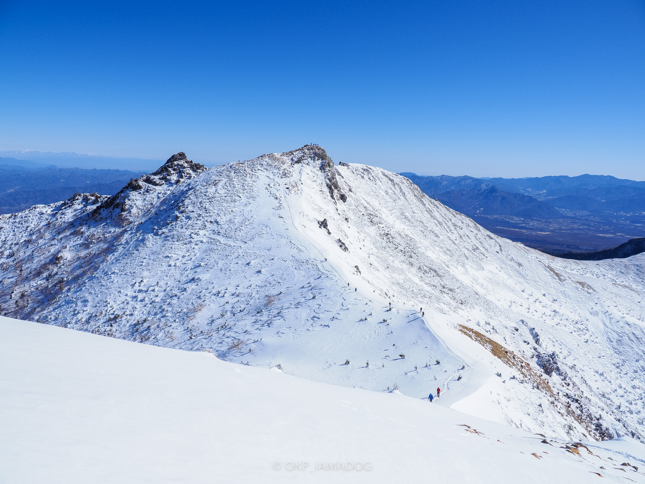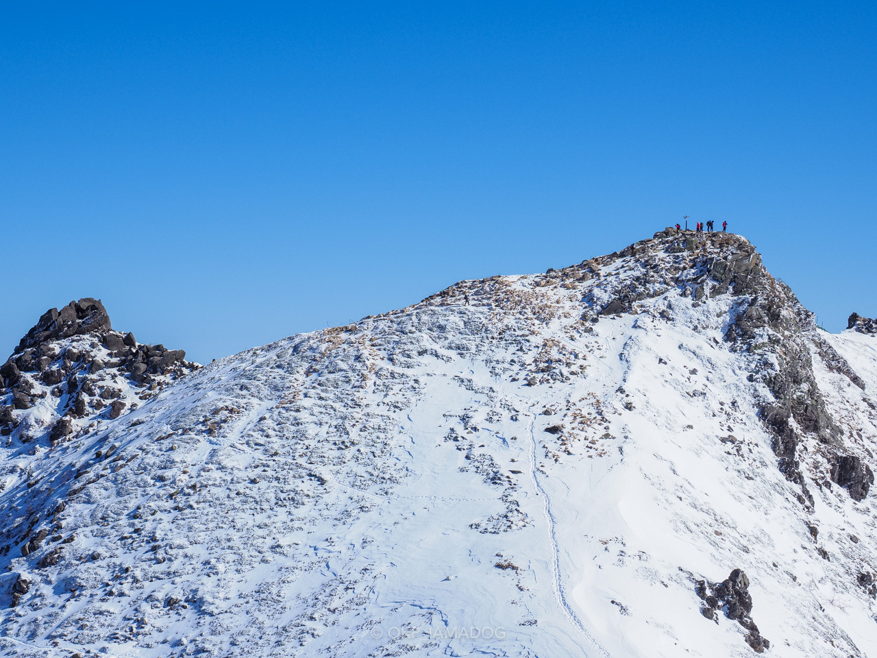 ちょいちょい岩場と雪のミックスがありますが、視界がいいので危険という程ではありません。アイゼンの歯を引っかけないように注意して登っていきましょう。