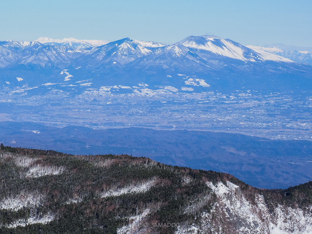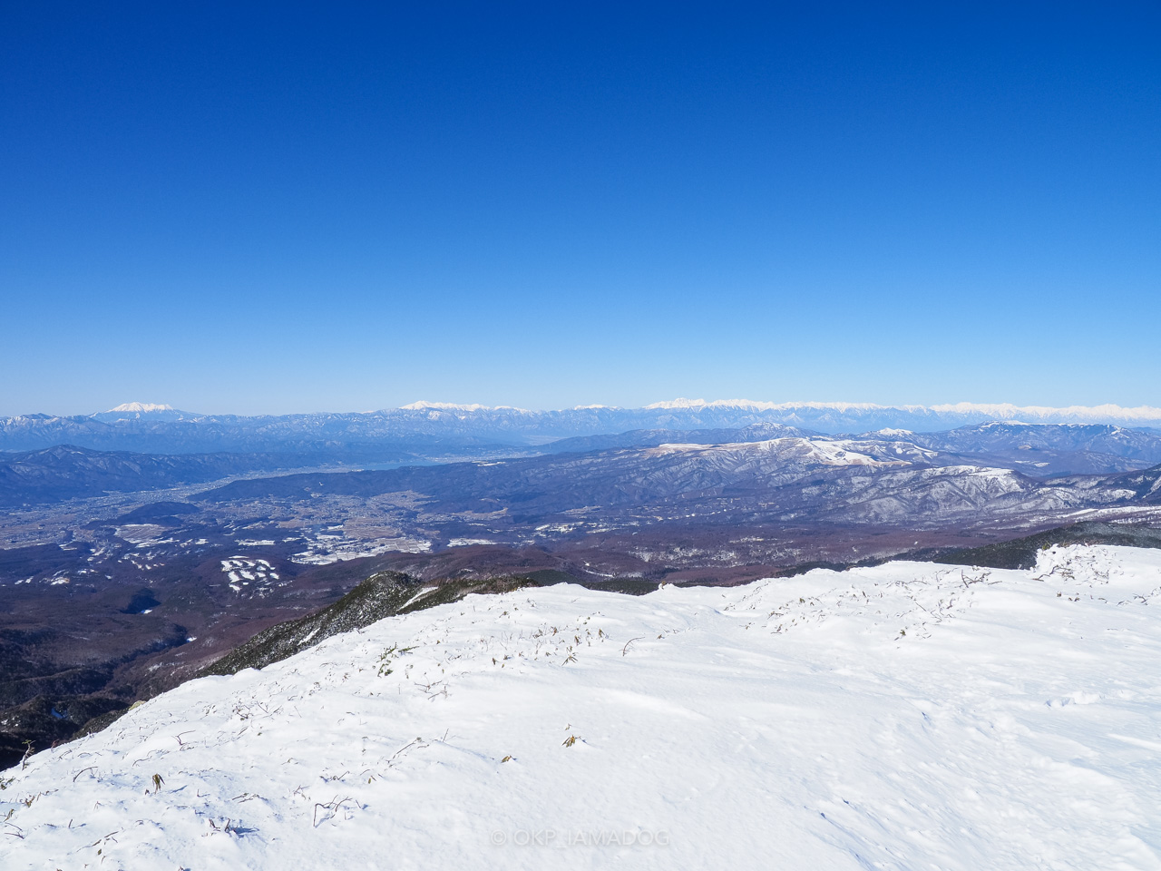 御嶽〜乗鞍〜北アルプスの山脈もクッキリ。中央付近に諏訪湖が写ってます。