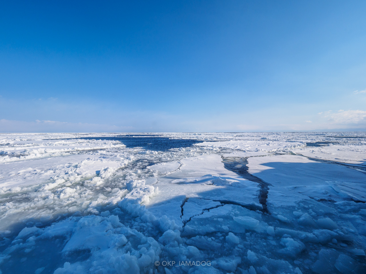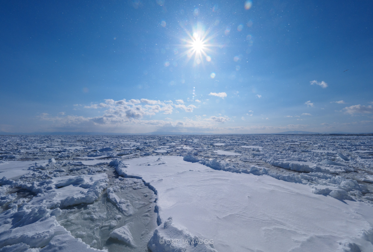 オホーツクの流氷は目の前の海水が凍ったものでなく、ロシアのアムール側河口の汽水域で凍った氷がはるばる流れてきているのだとか。そして、ようやく超広角レンズの出番。