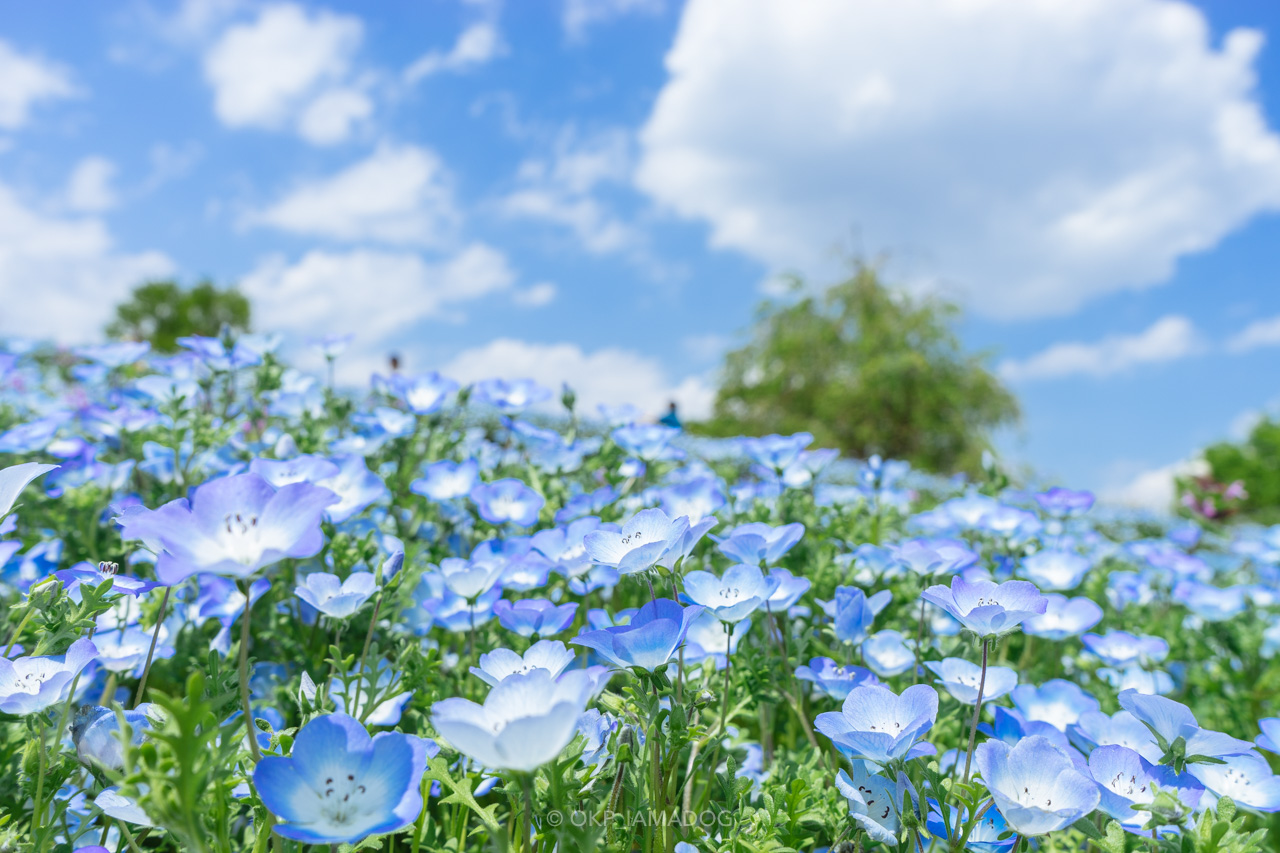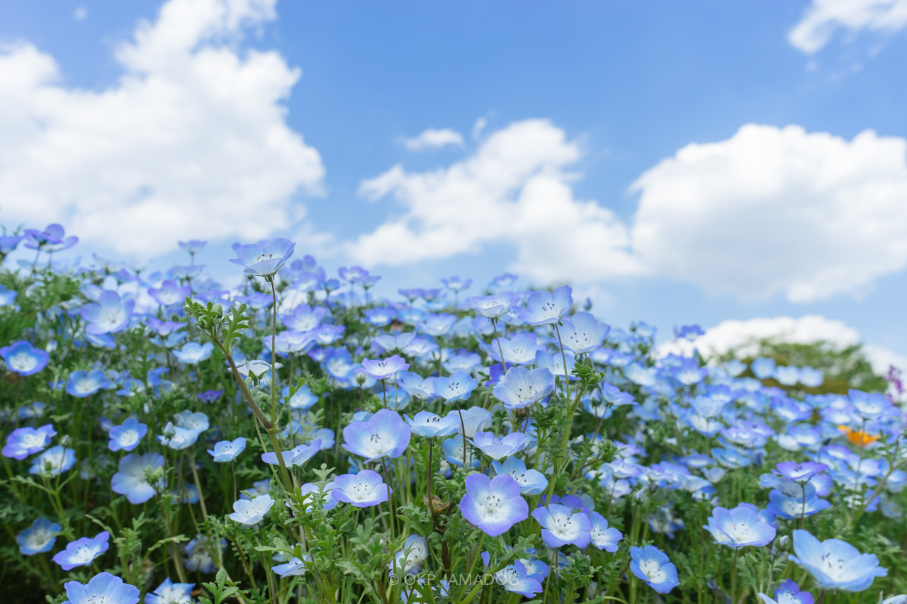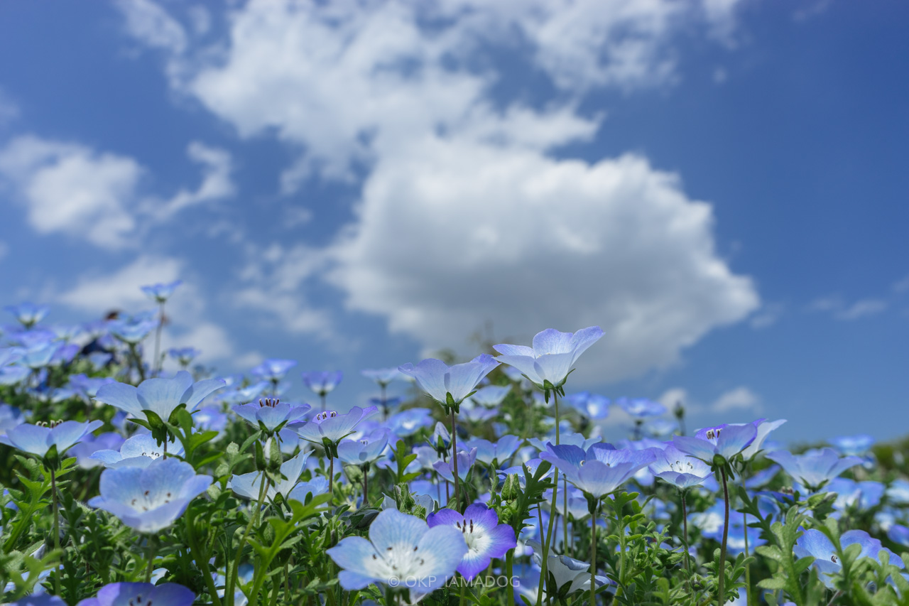 青と白のグラデーションのネモフィラの花に青空と白い雲、なんて清々しい光景なのでしょう。ところどころに違う色の花が混ざってきているのはご愛敬です。