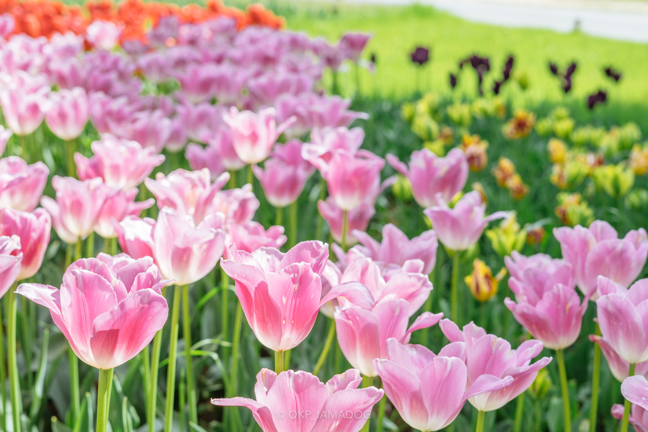 ネモフィラの小さな丘の向こうはチューリップガーデンになっています。今より少し前が見ごろだったようですが、まだまだ色鮮やかなチューリップの花が各種咲いていました。