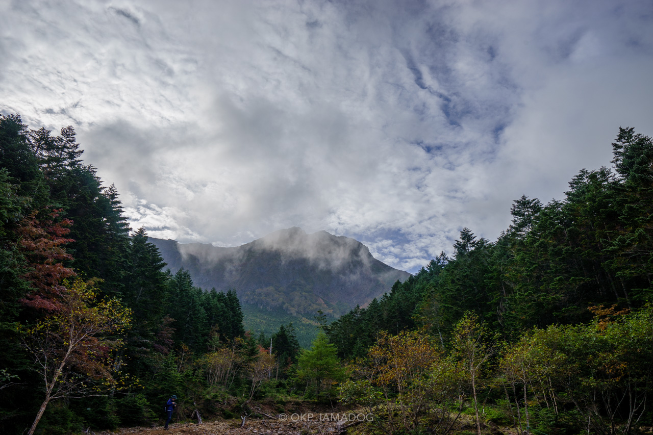 しばらくはまだ夏山の雰囲気ですが、標高2,000mを越えたあたりから徐々に秋の気配が漂ってきました。沢が開けて見えてきた赤岳にはまだうっすら雲が掛かっていましたが、お天気は徐々に晴れていく予報。期待して進みます。