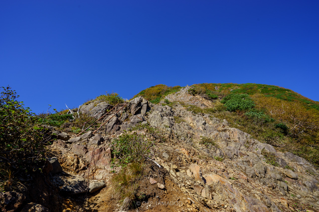 阿弥陀岳への上りはこんな感じ。ハシゴの後は急斜面のガレ場になっていて、難しいよじ登りこそありませんが、浮き石が多く落石にヒヤヒヤです(自分が落さないようにも)。下りの登山客が落とした拳大の落石が鼻先をかすめたときは肝を冷やしました。