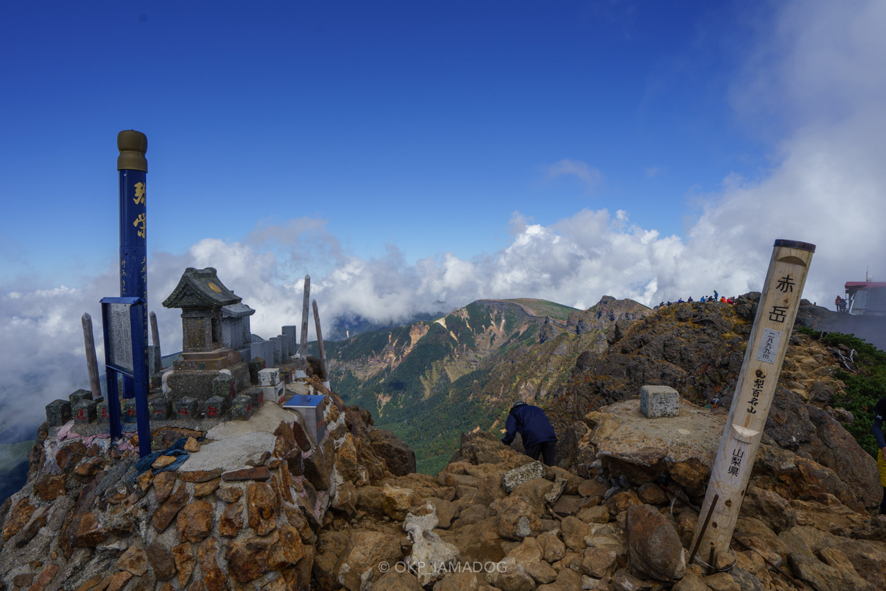 雲に包まれそうでなんとか晴れをキープしている赤岳山頂(南峰)には入れ替わり立ち替わり登山者で賑わっていました。