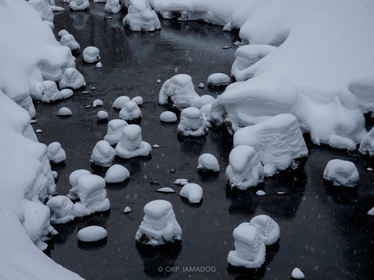 川の石に積もった可愛い雪のオブジェたち。カメラ&写真好きの一行なので、些細な変化が見つかるたびに足を止めての撮影会が始まります(たのしい)。