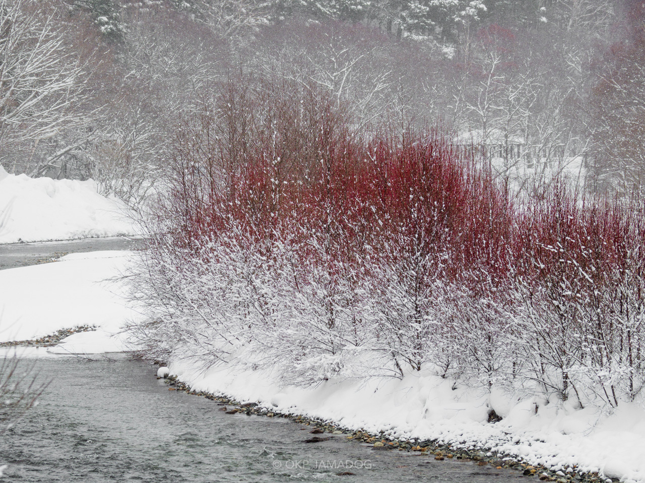 梓川の川岸、白い雪の中に赤く目立っているのはケショウヤナギの木です。赤い小枝が目立つのは晩秋から春にかけてのことらしく「雪景色の中の赤」は釜トンネル閉鎖中のこの季節じゃないと見られない光景です。