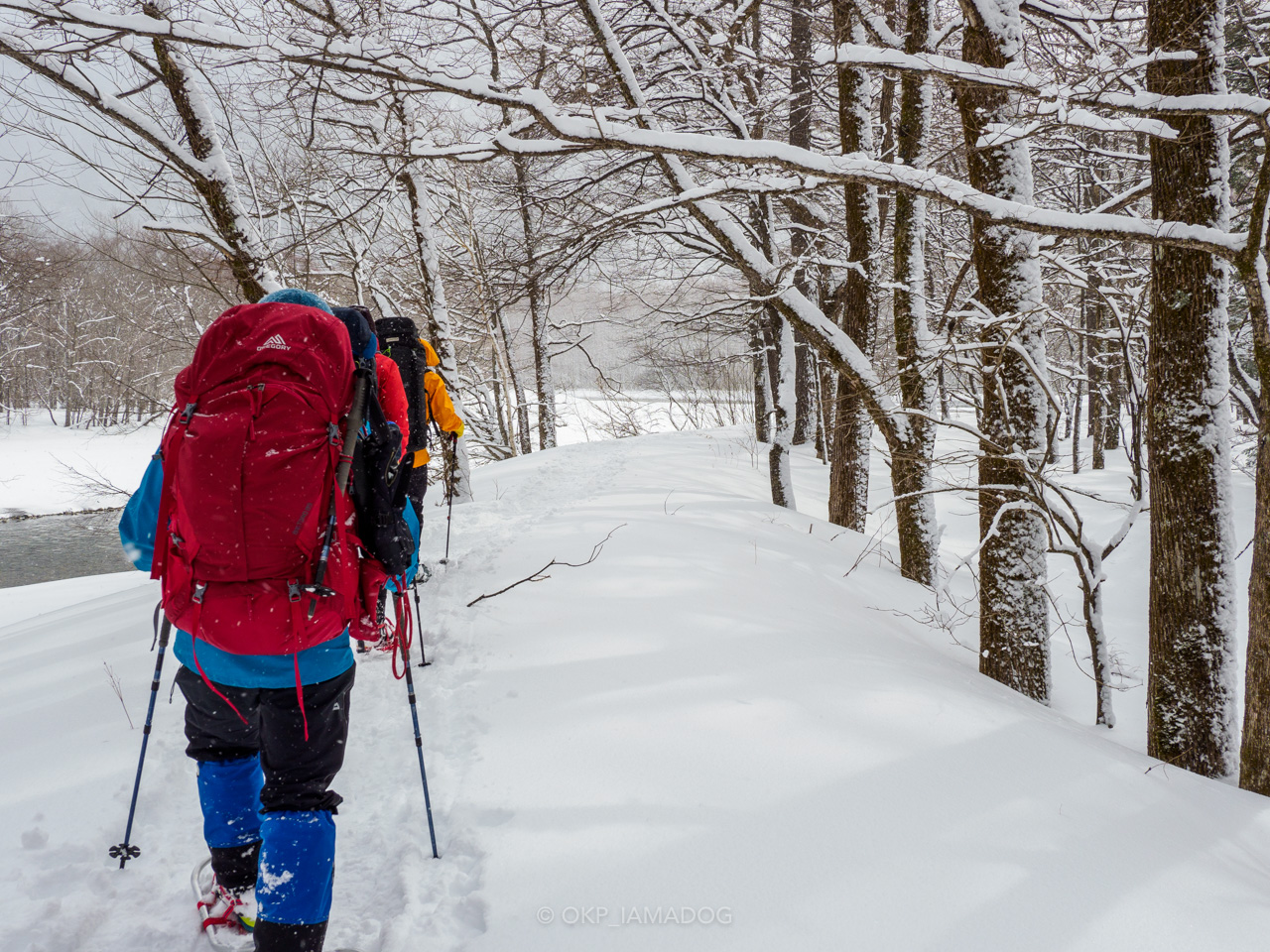 大正池の右岸側を回るコースを取り始めるといよいよトレース(踏み跡)のない雪道がスタートです。といってもラッセル(雪をかき分けて進むこと)という程でもなく、登山靴のままふわふわ新雪の上を歩いていきます。ゆるいペースで写真を撮りながらふわふわの雪を歩く、ゆるふわハイク。