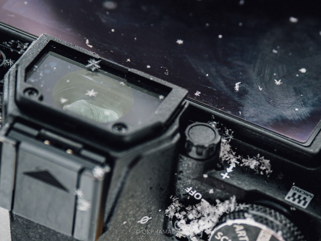 カメラのファインダーに積もった雪の結晶が美しい(ピント合ってない)。釜トンネルの手前では重たいボタ雪でしたが、上高地の中は比較的サラサラの雪が降ってます。これは気温の差かな? といってもこの日はそこまで寒くなくて、氷点下ひと桁ぐらい。