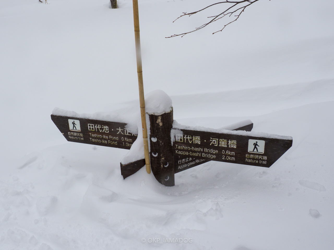 夏には緑の湿原となる田代池。これだけ雪が積もっても浅い田代池(砂の堆積で徐々に小さくなってる)がしっかり水をたたえてる所に、梓川水系の水量の豊富さを感じることができます。