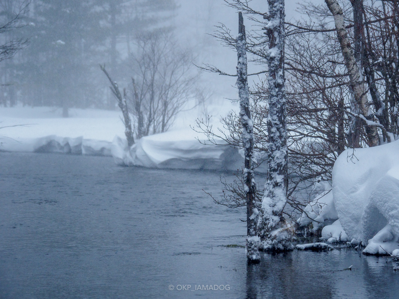 雪の中の対岸リフレクション。こんなお天気じゃなければ見られなかった光景です(ポジティブ思考で)。