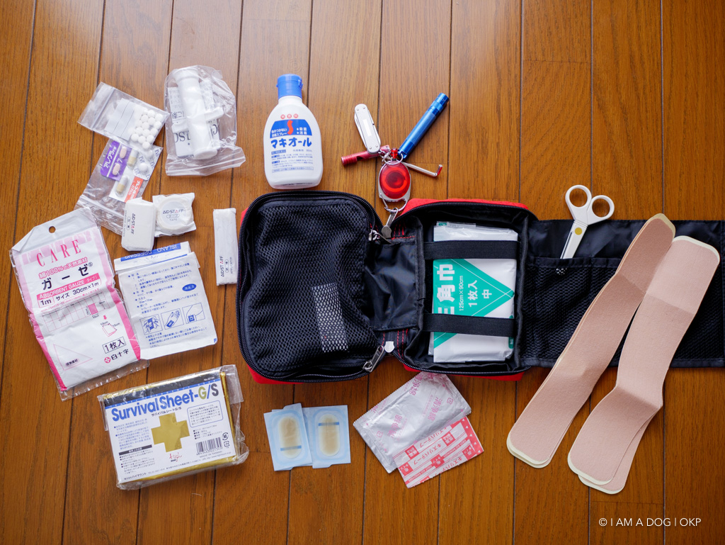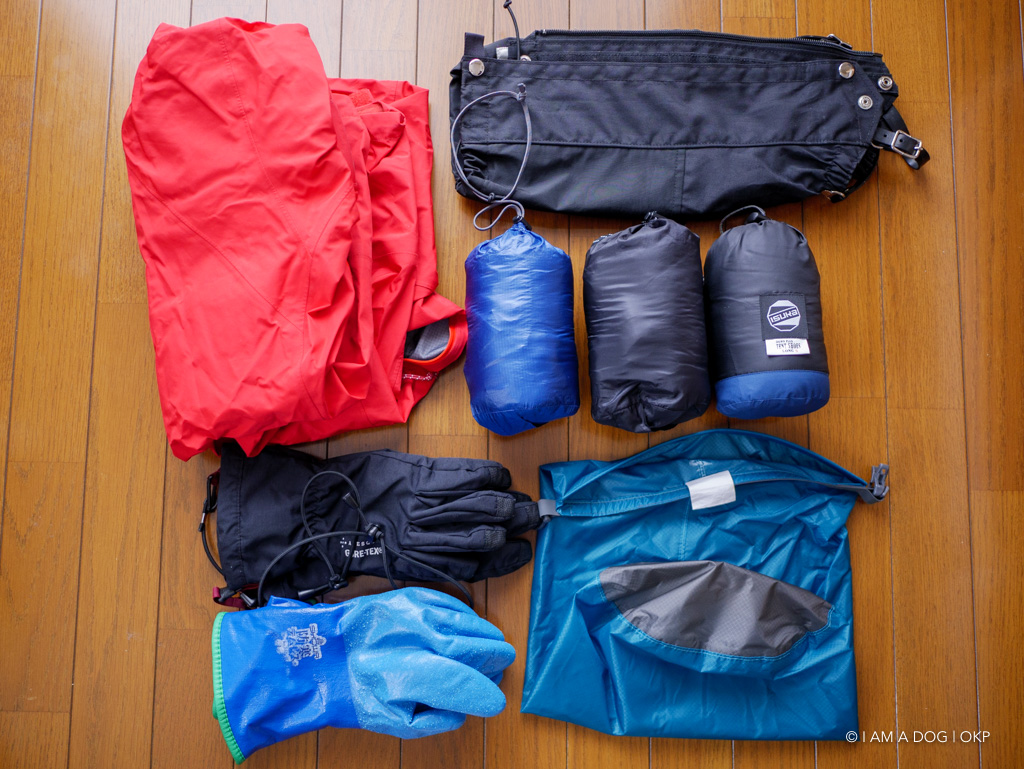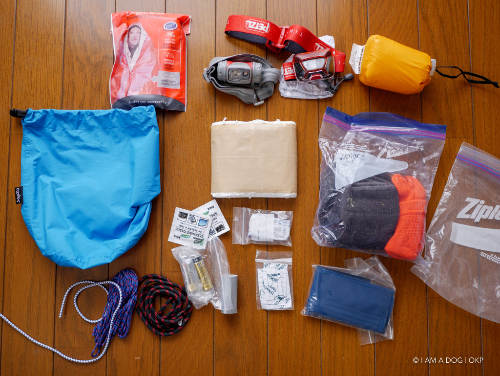 エマージェンシーシート、ヘッドライト2個、アライのビバークツェルト、細引き、靴紐、ゴム紐(テント補修用)、交換電池、ダクトテープ、リペアテープ、携帯トイレ、予備靴下、予備インナー手袋、予備パンツ、予備コンタクトレンズ、芯を抜いたトイレットペーパー等々… 濡れたら困るものはジップロックに入れておきます。