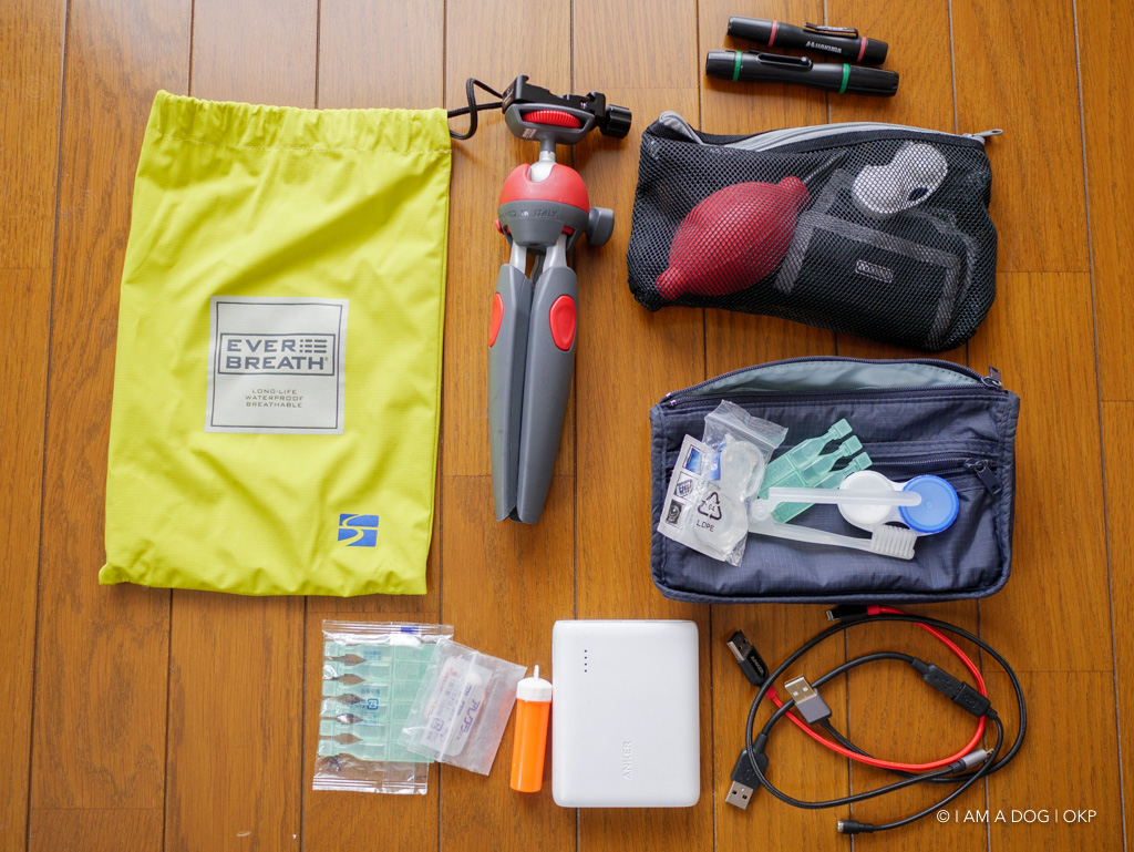 ブロワやミニ三脚、レンズペン、レンズティッシュといったカメラ関連の小物。大容量のモバイルバッテリー、充電ケーブル類、目薬、常備薬、予備コンタクトがここにも。