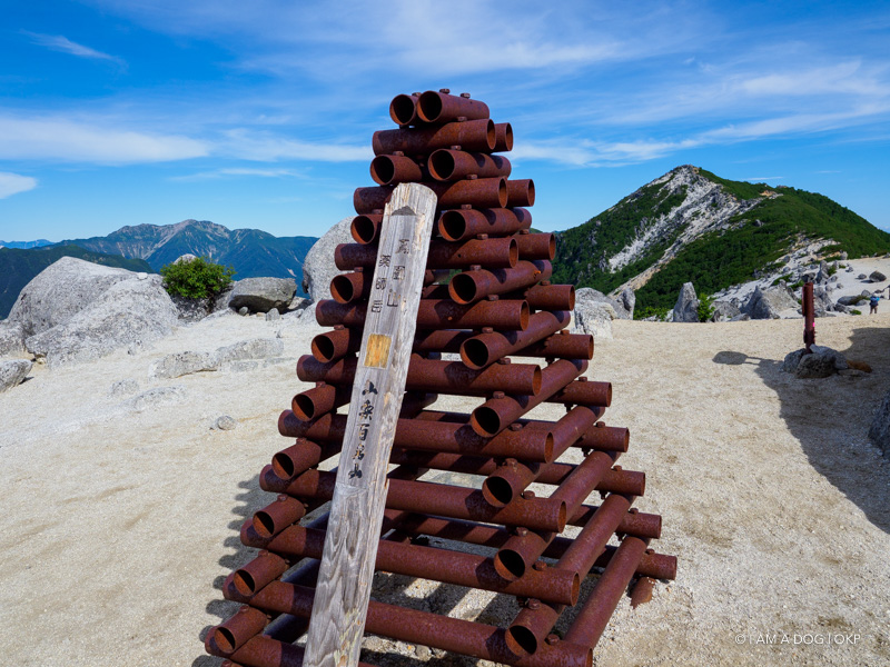 この場所は「赤抜沢ノ頭」なるポイント。鳳凰三山のある稜線の中で一番北に位置する地蔵岳はちょこっとだけ北東方面に離れた感じ…… というか稜線が枝分かれした感じ? ただしこのオベリスク部分のみが地蔵岳でなく、この辺り一帯が地蔵岳ってことでいいのでしょうかね(槍ヶ岳にしても槍の穂先だけが槍ヶ岳な訳ではないですし)。