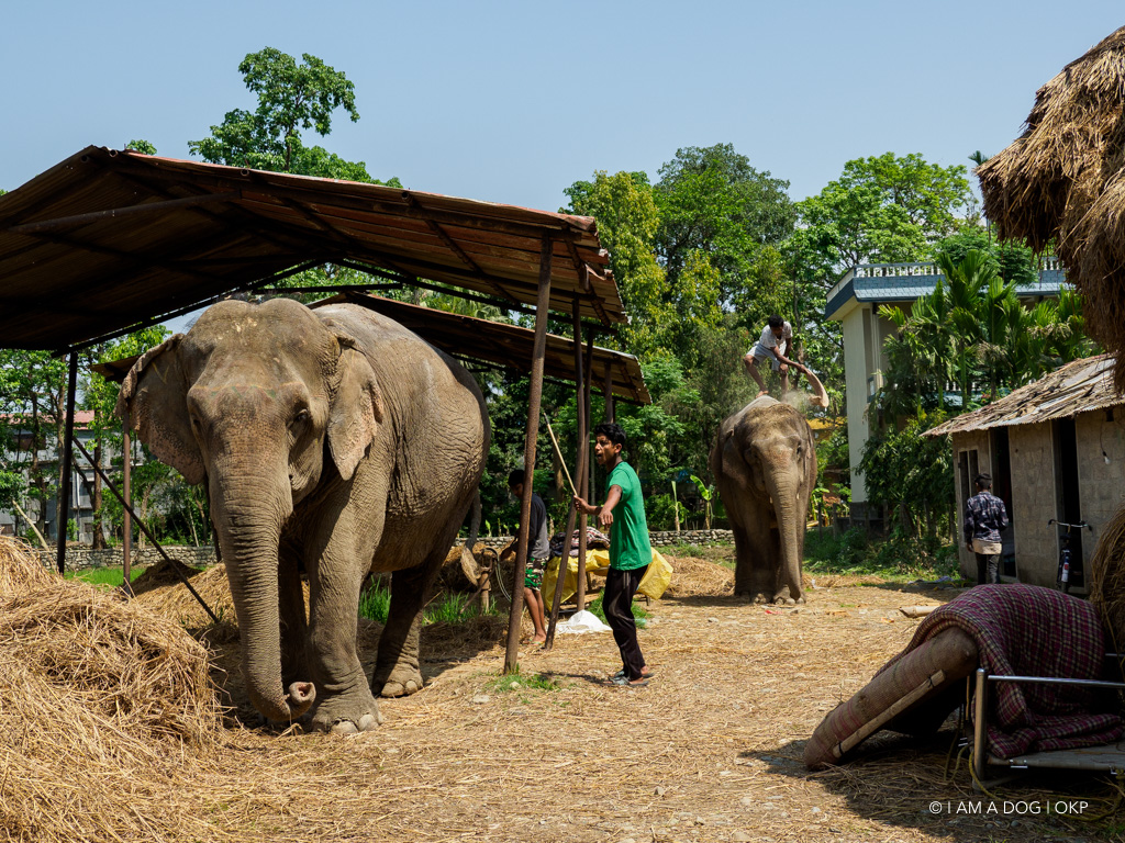 ふと隣を眺めると象たちがお出かけ。背中に乗せているのは人を乗せて観光するための台座ですね。