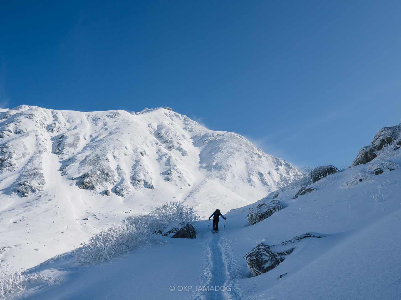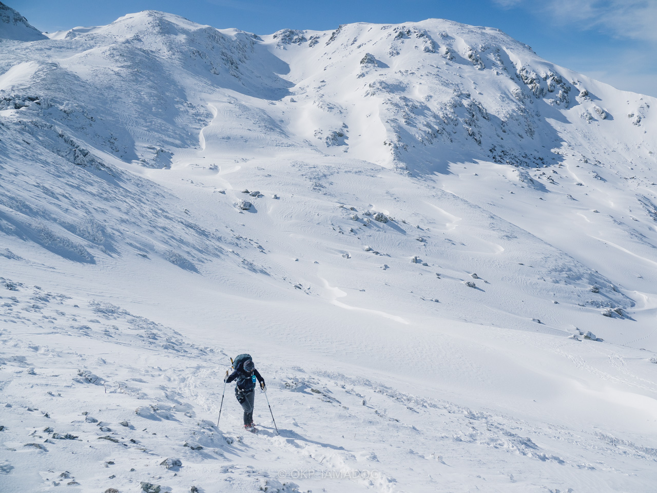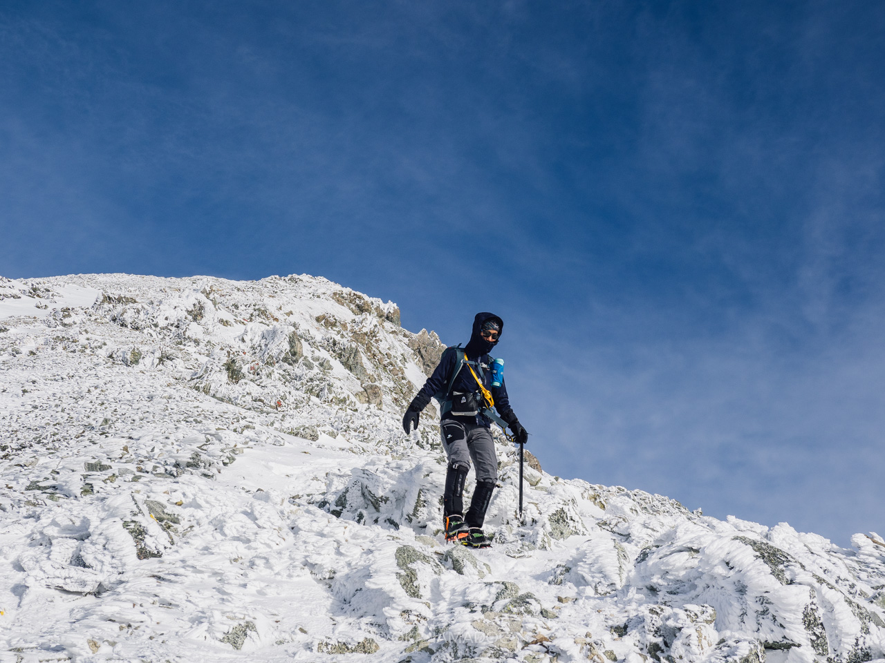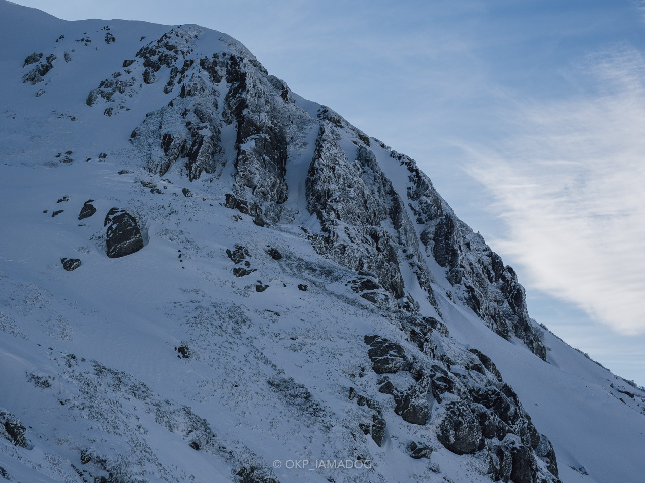 比較的急登なのでグングン標高が上がります。岩と雪のミックスですが、雪はクラストする手前ぐらいでアイゼンもよく効きますし、風の影響以外は歩きやすい印象です。