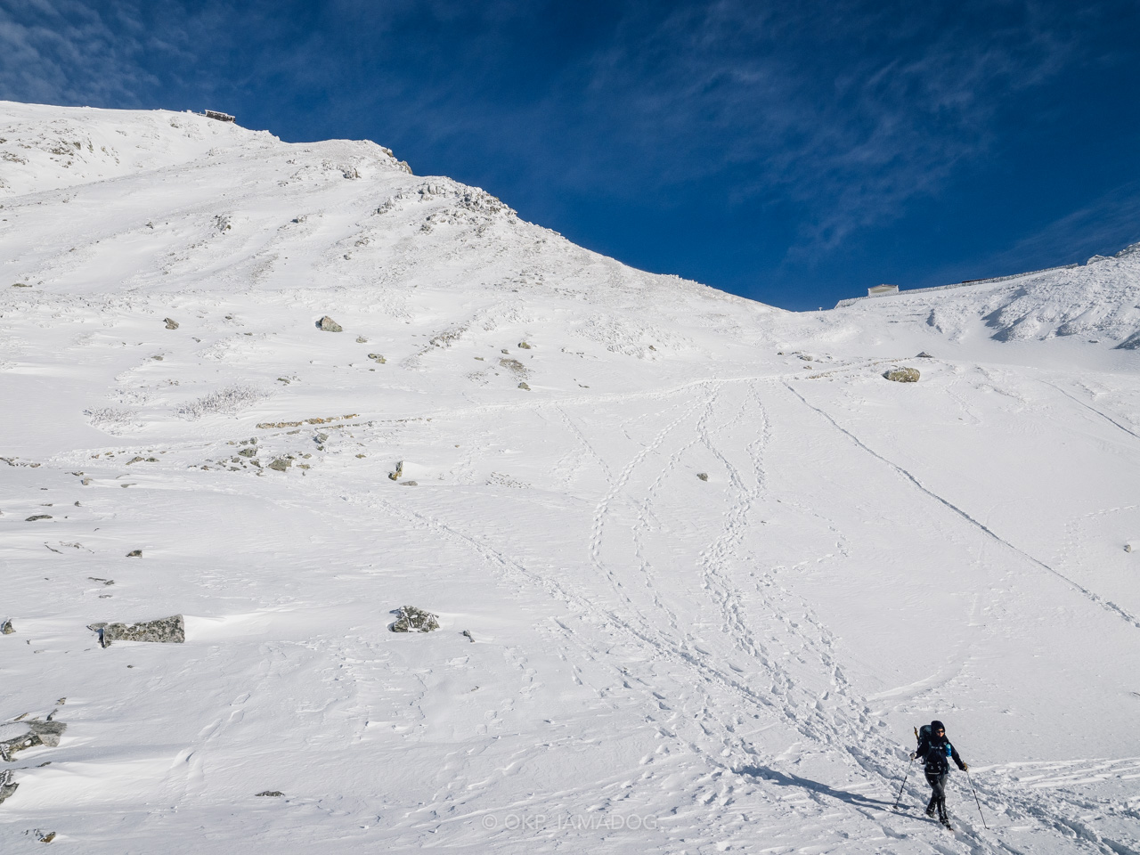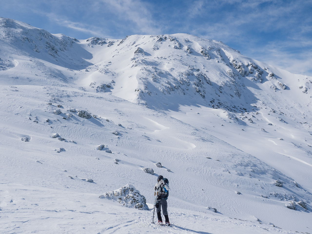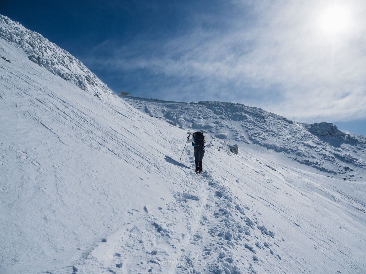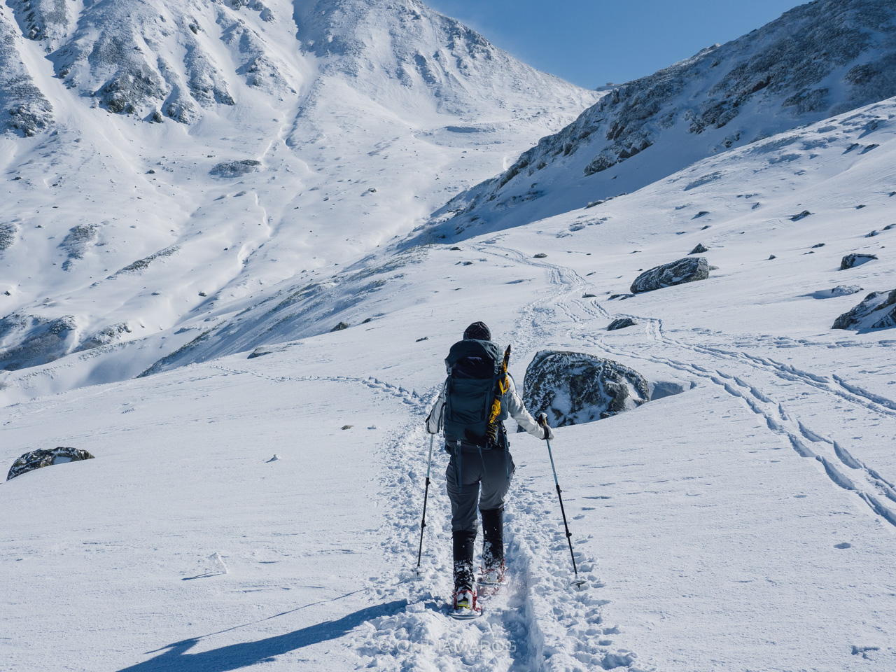 比較的急登なのでグングン標高が上がります。岩と雪のミックスですが、雪はクラストする手前ぐらいでアイゼンもよく効きますし、風の影響以外は歩きやすい印象です。