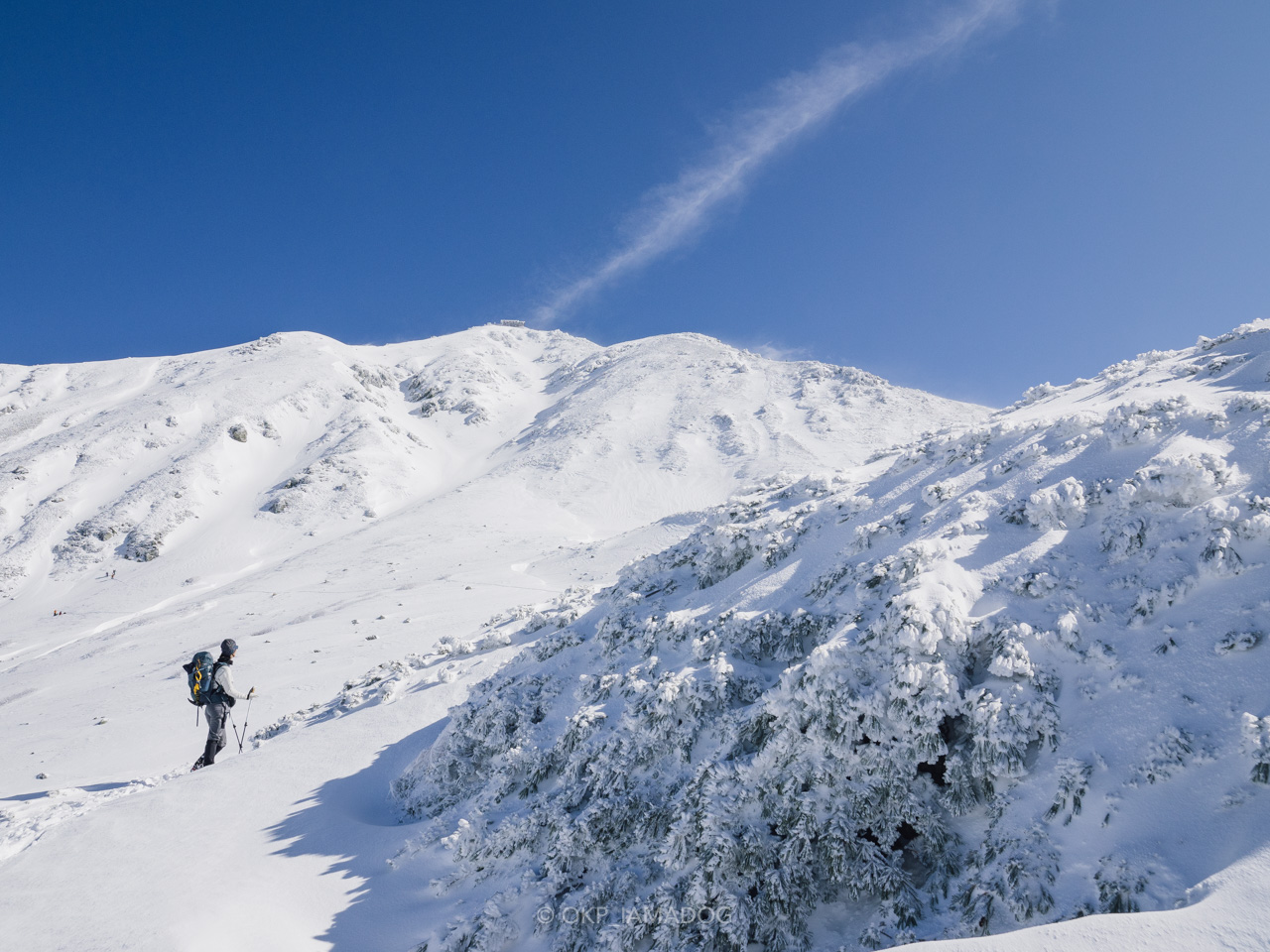 ハイマツもすっかり雪化粧。霧氷というかエビの尻尾が育った樹氷になってますね。