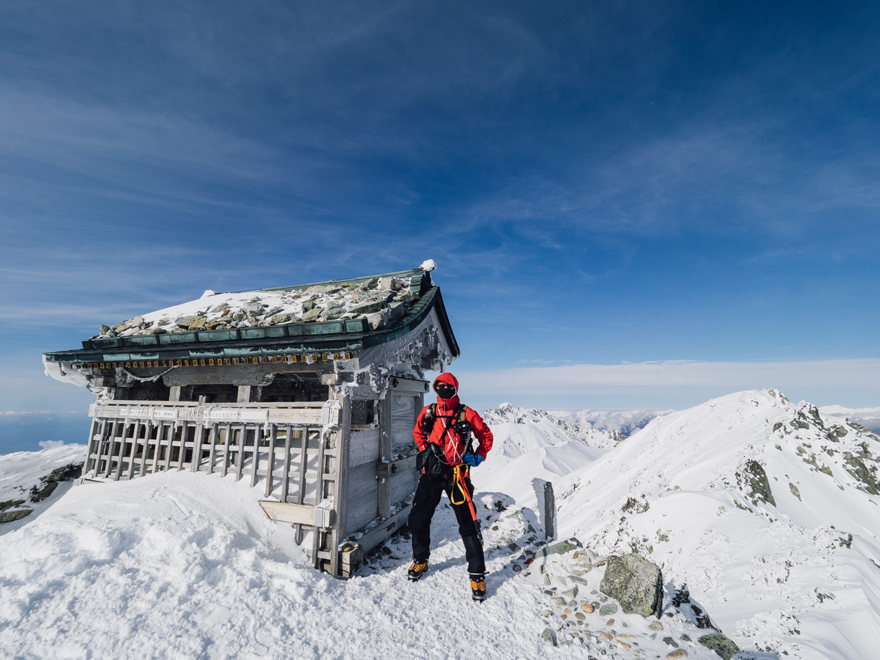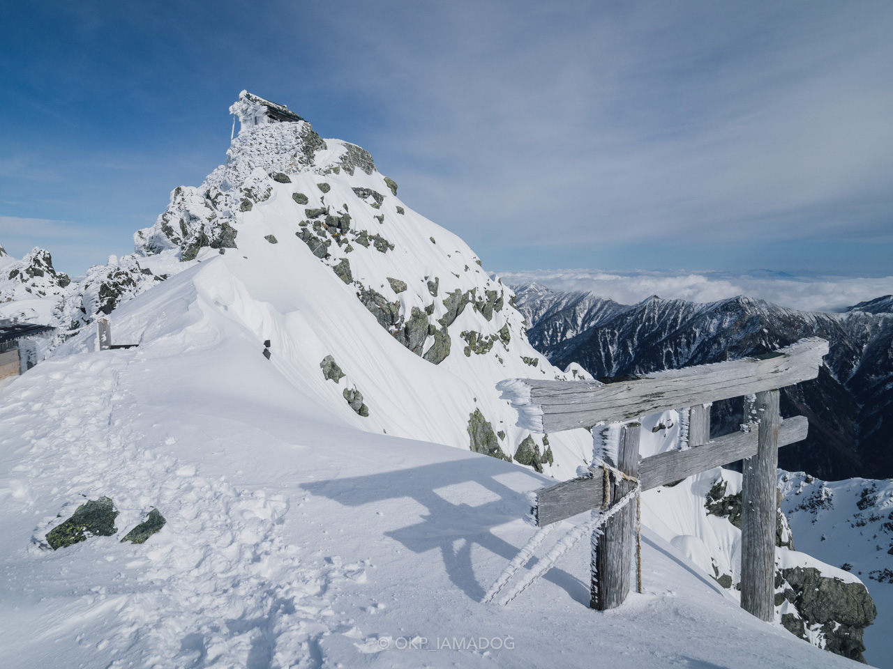 雄山神社の峰本社 神殿。鳥居も結構雪を被ってます。本当に3000mを超えているのはあそこだけかな。