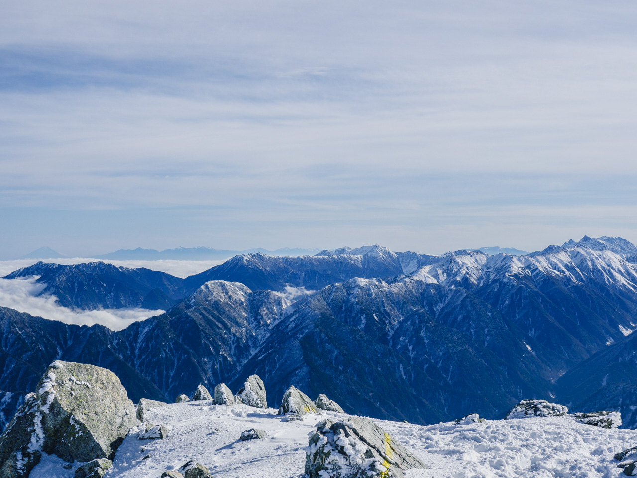 槍ヶ岳、水晶岳、笠ヶ岳…… 北アルプス南部もよく見えてます。