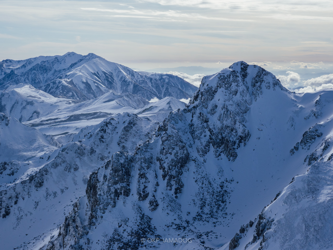 風は強くなってきましたが行けない程ではない。予報では15m/sになっていましたが、体感でも10数m/sはあるように感じました。4月に別山側から縦走した際はこちら側の斜面はかなり雪が消えていましたが、雪が付き始めのこの時期の方が雪深いですね。