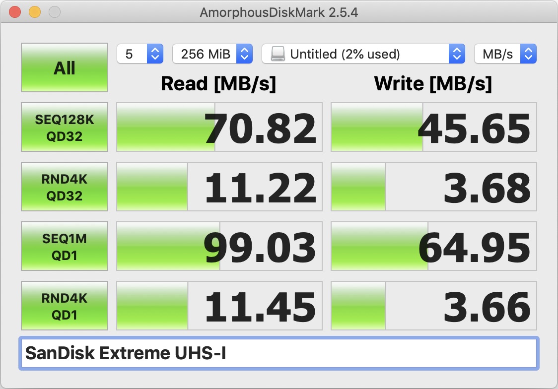 アプリで速度計測すると、Disc Speed TestではLexar Professional 1667xよりも少しだけ書込が速く、AmorphousDiskMarkだと少し遅く計測されるようです。まあ似たようなスペックと判断しました。