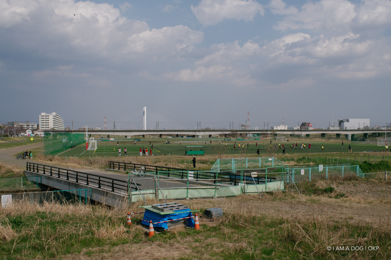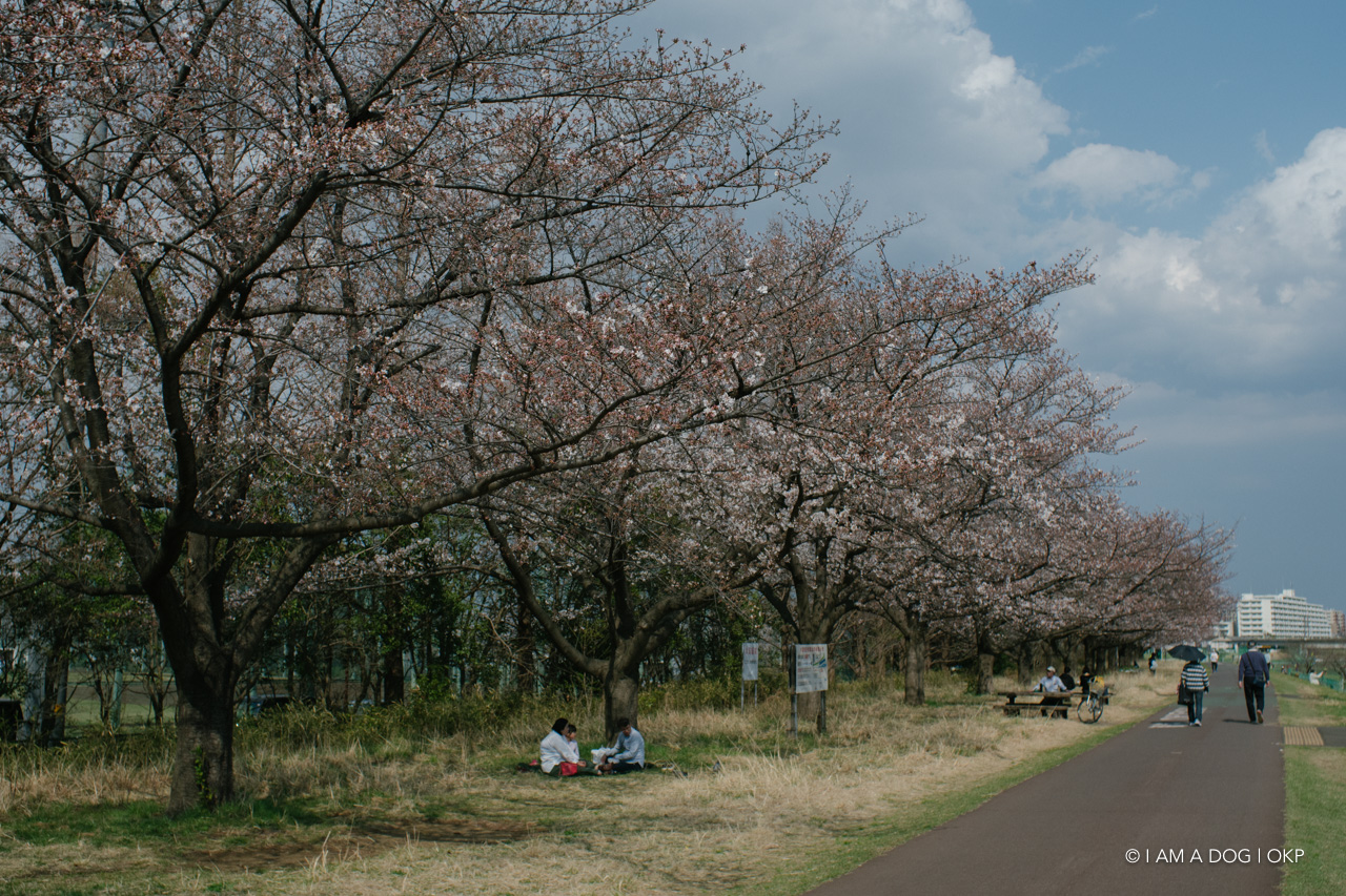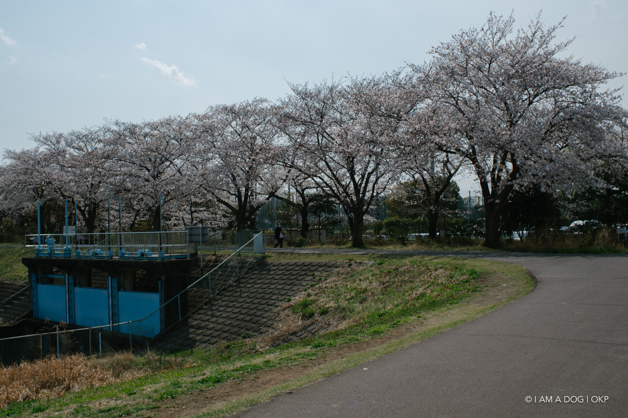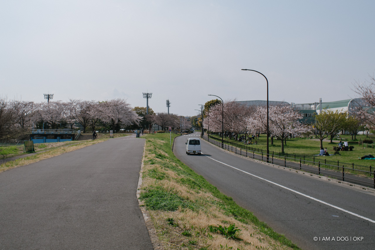 府中市場を出て5分も歩けば多摩川沿いの多摩サイに出ます。右手は「金塚桜広場」、正面は「郷土の森公園 庭球場」や「郷土の森公園 第一野球場」で、そこそこ桜を楽しめるエリアになっています。