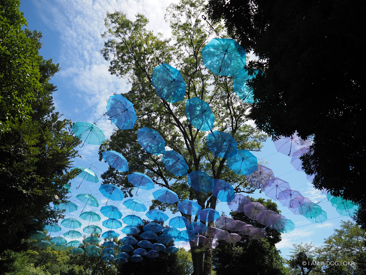 入場すると木の間にビニール傘がたくさん吊り下げられていました。通りかかった際に、クライアント相手に園内を案内してる感じの人が「スカイパラソルです!」と言ってたので「スカイパラソル」です。