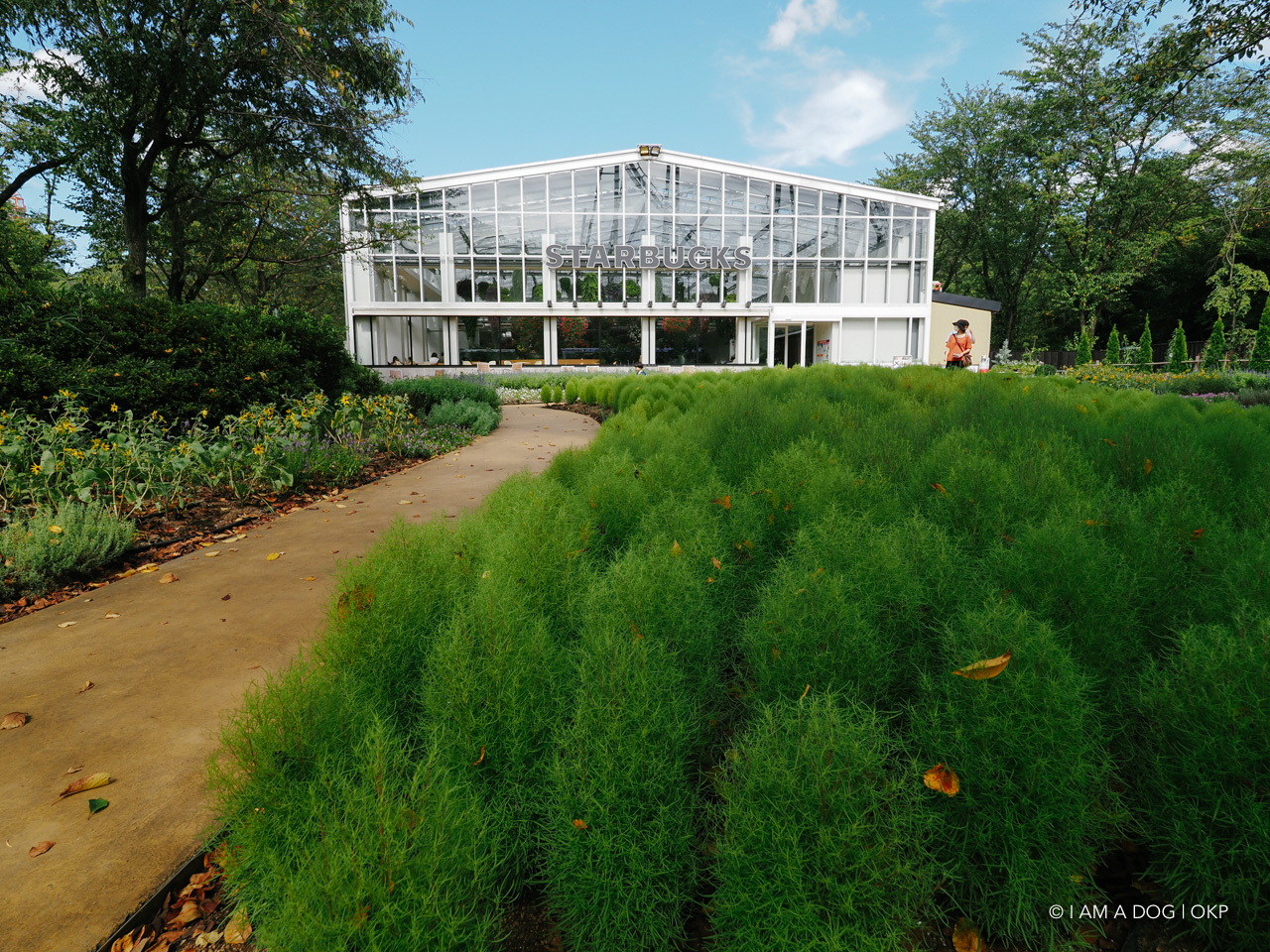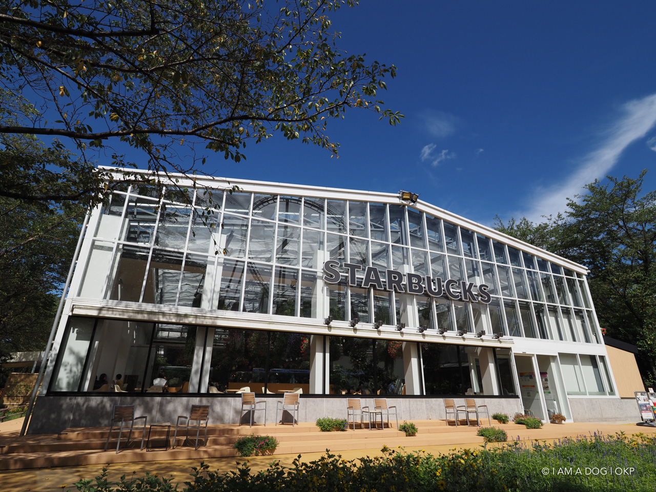 逆側に回るとスターバックス。温室風の外観ですがもちろんこの季節はエアコンが効いています。
