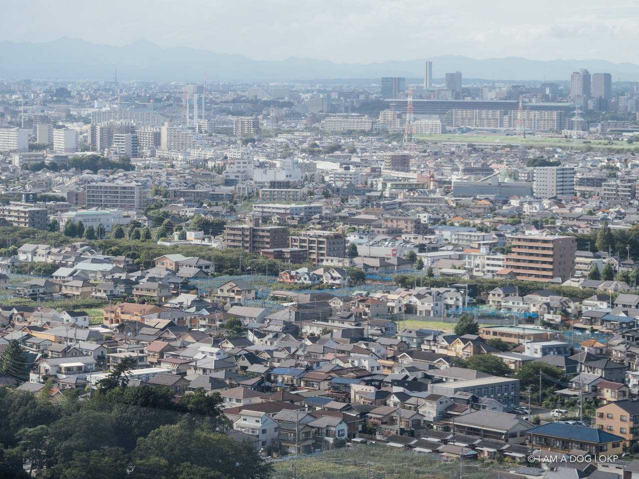 府中方面。中央少し左上に是政橋の主塔が見えています。右奥には東京競馬場のフジビュースタンドも見えています。そして手前の稲城市、やはり果樹園が多い!
