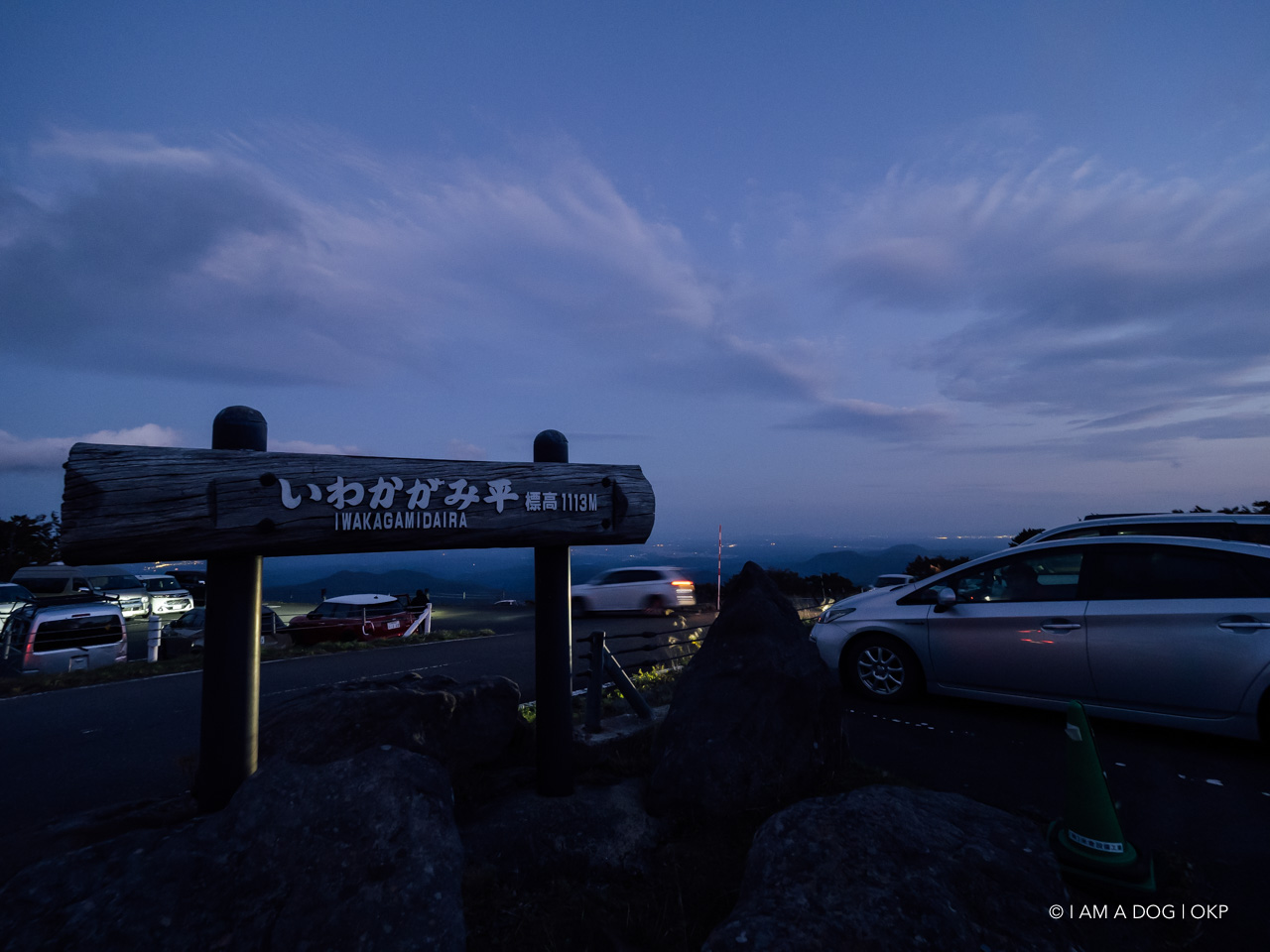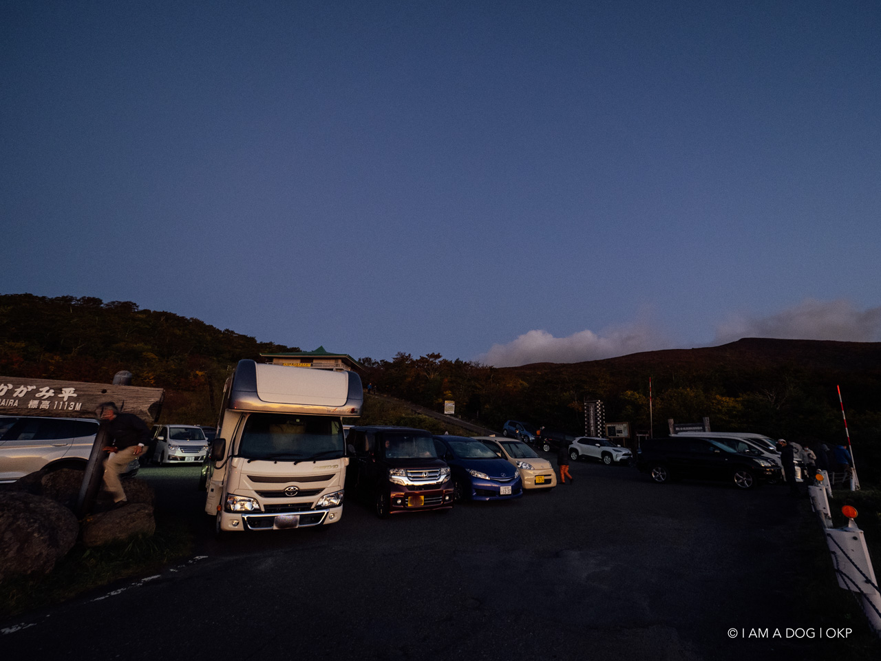 コンビニで翌日の食事などを仕入れつつ、18時前にいわかがみ平の駐車場に到着。いわかがみ平には3つの駐車場があるのですが、トイレがある真ん中の小さい駐車場は既に満車で、一番大きい上の駐車場も既に3割程度埋まっていました。コロナ禍でマイカー旅の需要増、車中泊旅も増えてるといった話は耳にしてましたが、この分だと日をまたぐ前には駐車場は埋まってしまいそう。