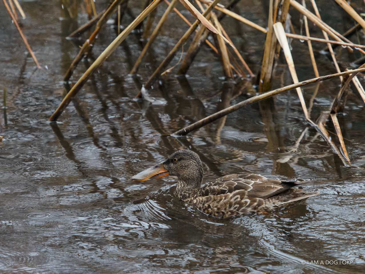 いつも同じあたりに1羽だけ居るハシビロガモのメス(?)、同じ個体なのかな。