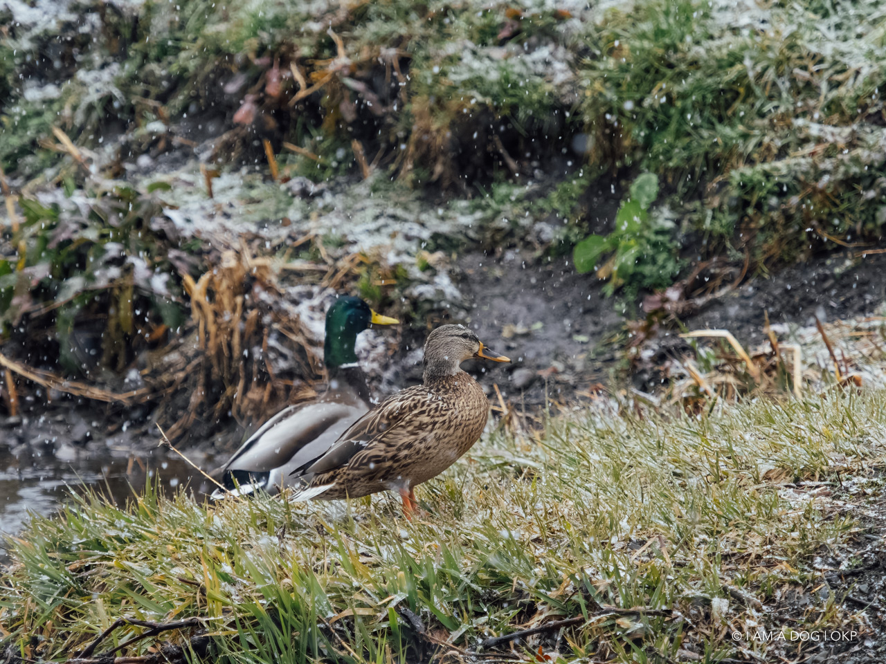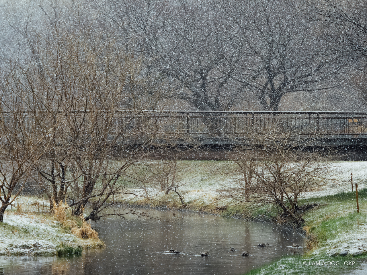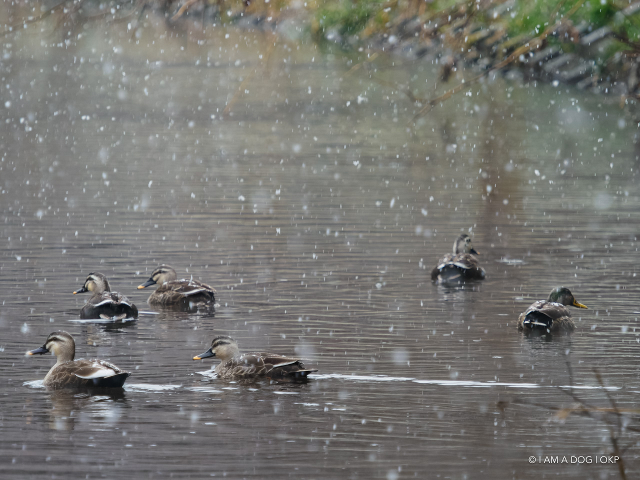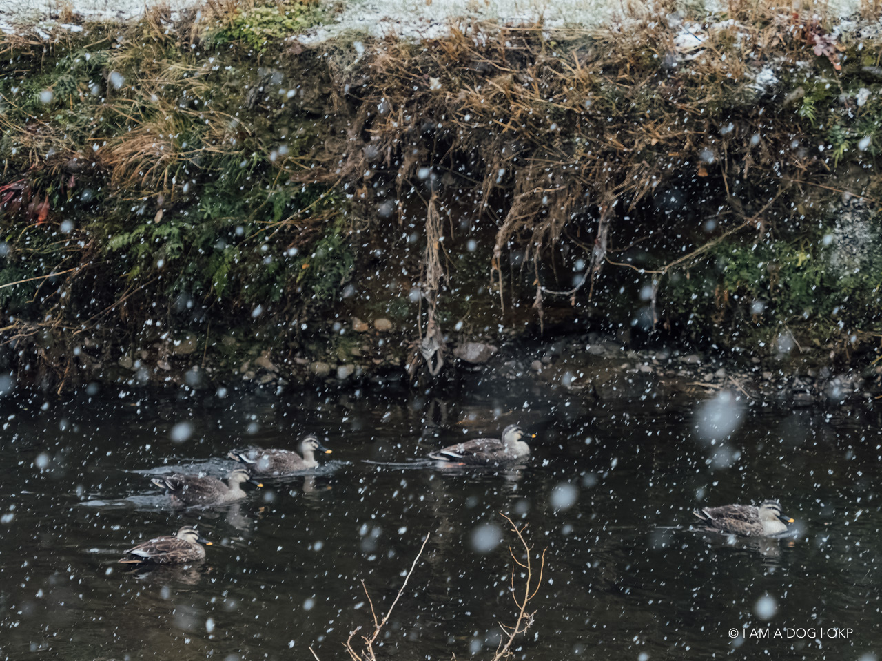 何度目かの雪とカルガモ。こういう写真は本当にこの日しか撮れない。