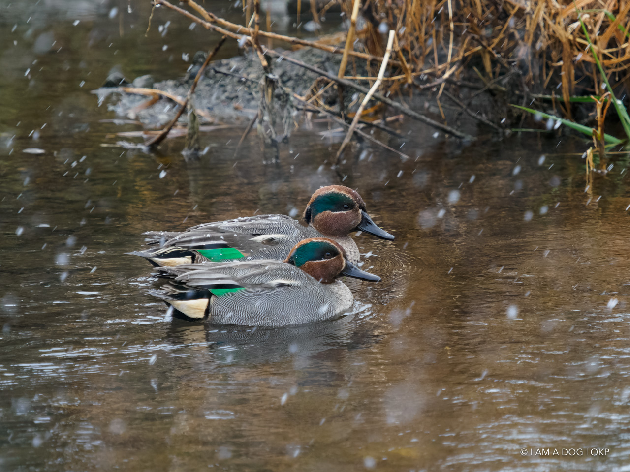 コガモ。普段はカップルが多いのですが、珍しく大小2羽のオスが仲良く並走してました。