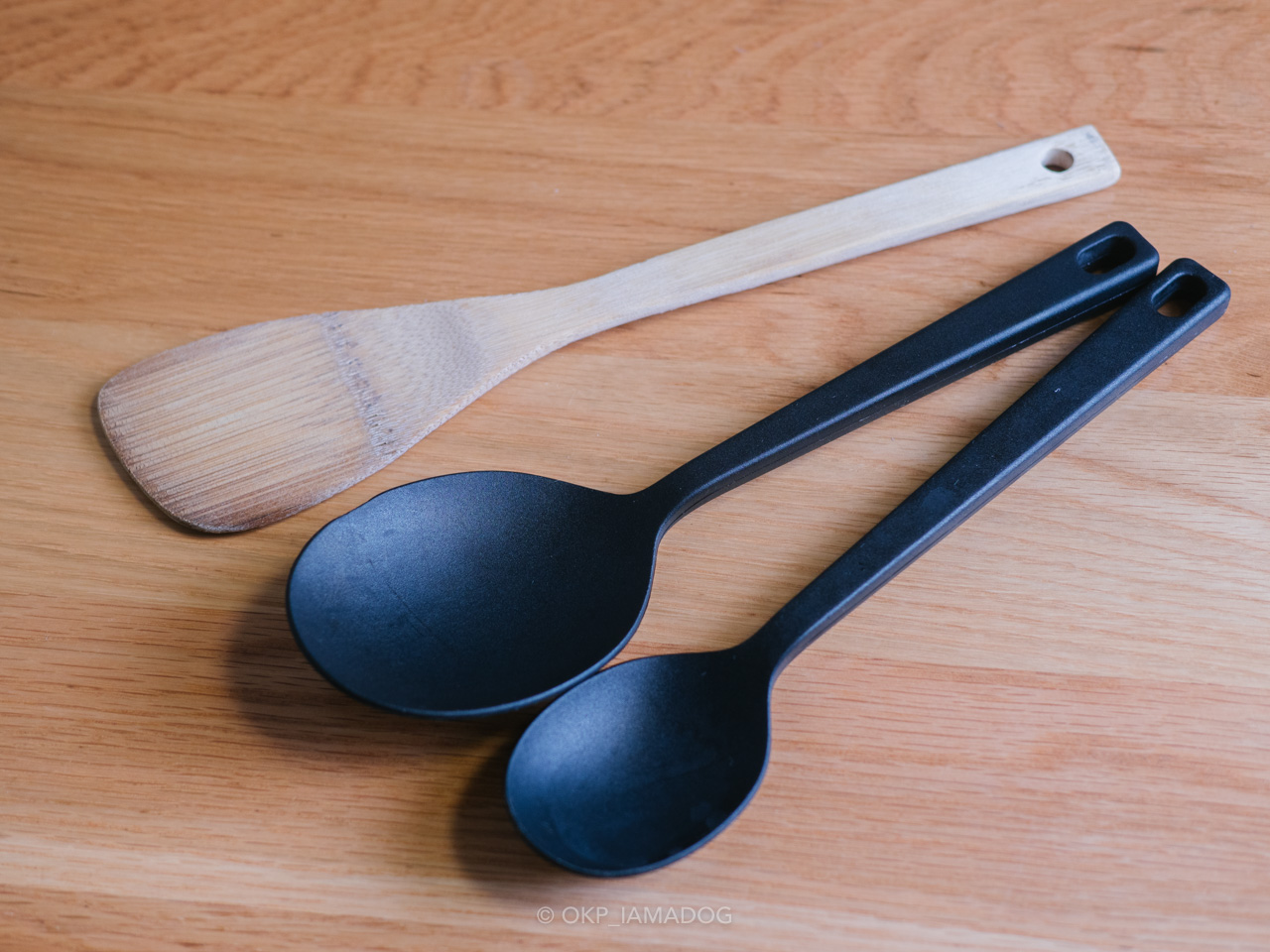 木べらの代替は数年前から使ってる無印良品の「シリコーン調理スプーン」で大丈夫でしょう。汁物のお玉にはなりませんが、中華の炒めもの全般、カレー、シチューなどを作る際には木べらとお玉を兼ねた使い方ができてなかなかに便利なアイテム。大小サイズ買いましたが、大だけあれば同じ日に両方使うことは殆どないかも(小さいサイズはスプーン型よりも角のあるシリコンヘラの方が出番が多いを思います)。