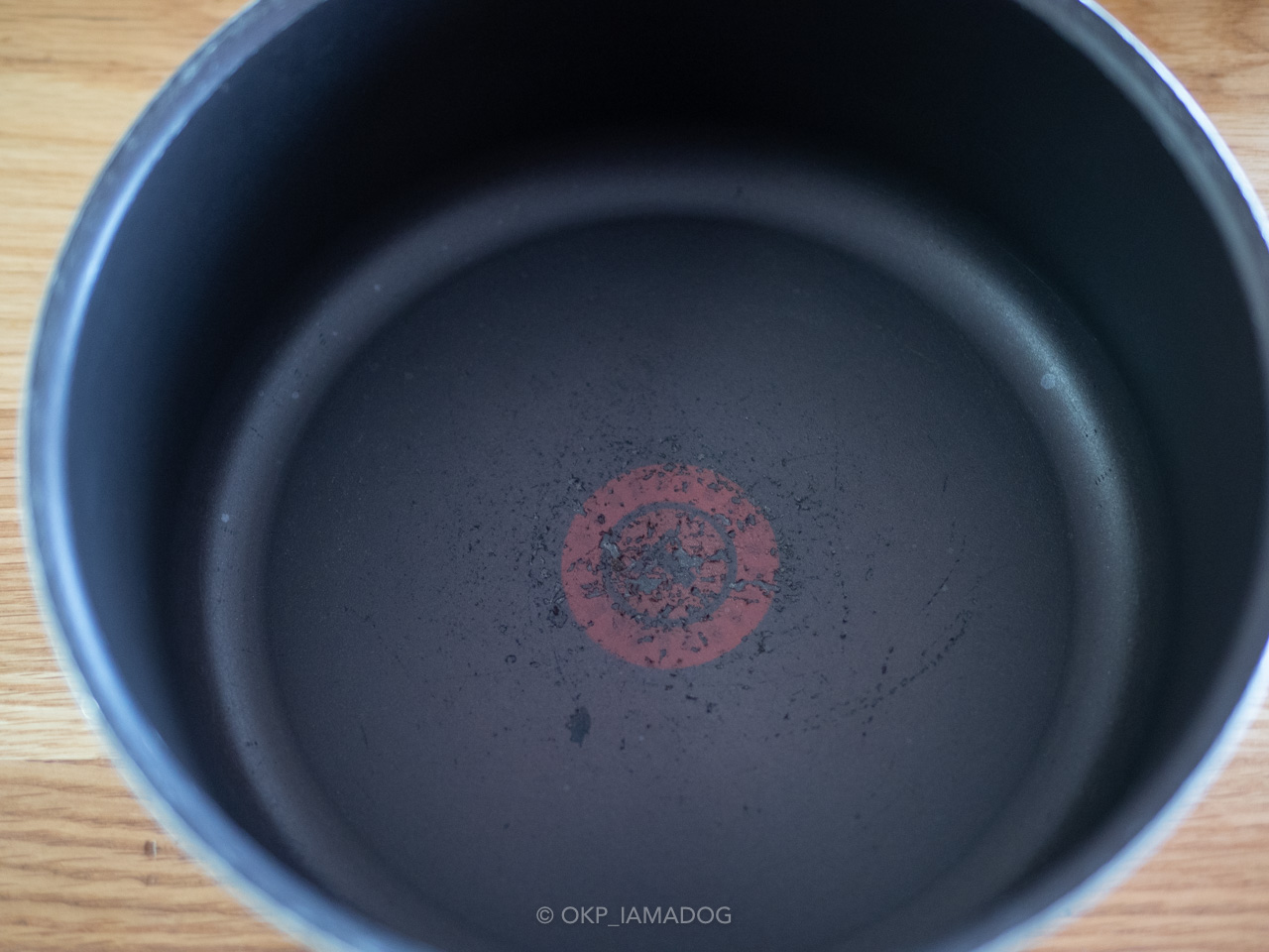 最も劣化が激しいのは16cmのソースパン。毎日味噌汁やスープ作りで最も出番が多い鍋で、前回も4年程で単品で買い替えていた鍋です(つまり12年で通算3個目)。中央部分は完全のアルミの地が出てしまっていますが、やはり一番火が当たる部分だからなのか……?