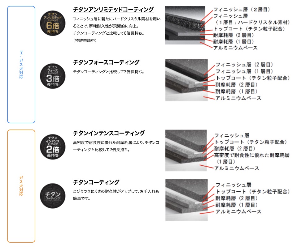 | コーティング | コーティング層 | チタンコート比の耐久性 | 対応コンロ |