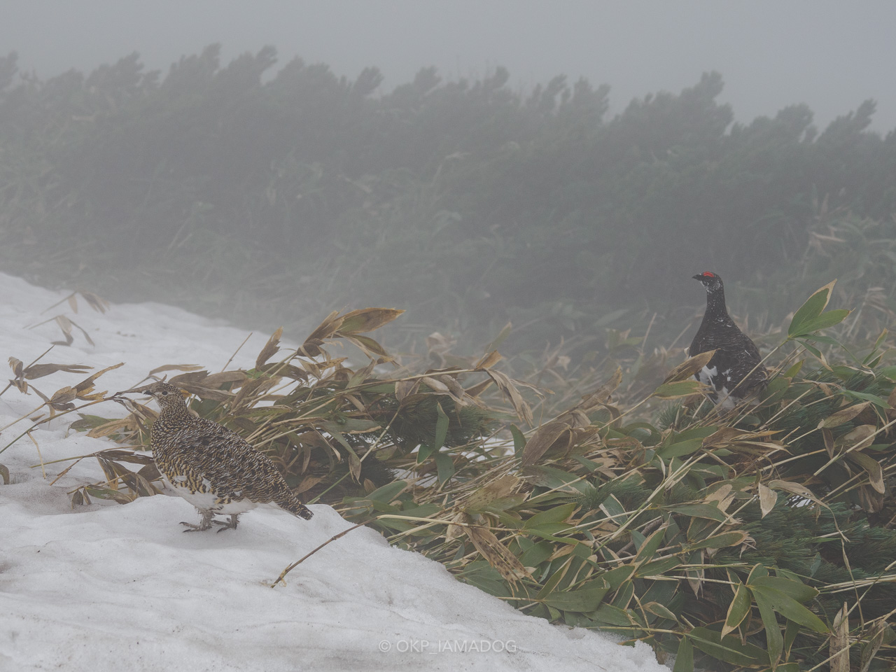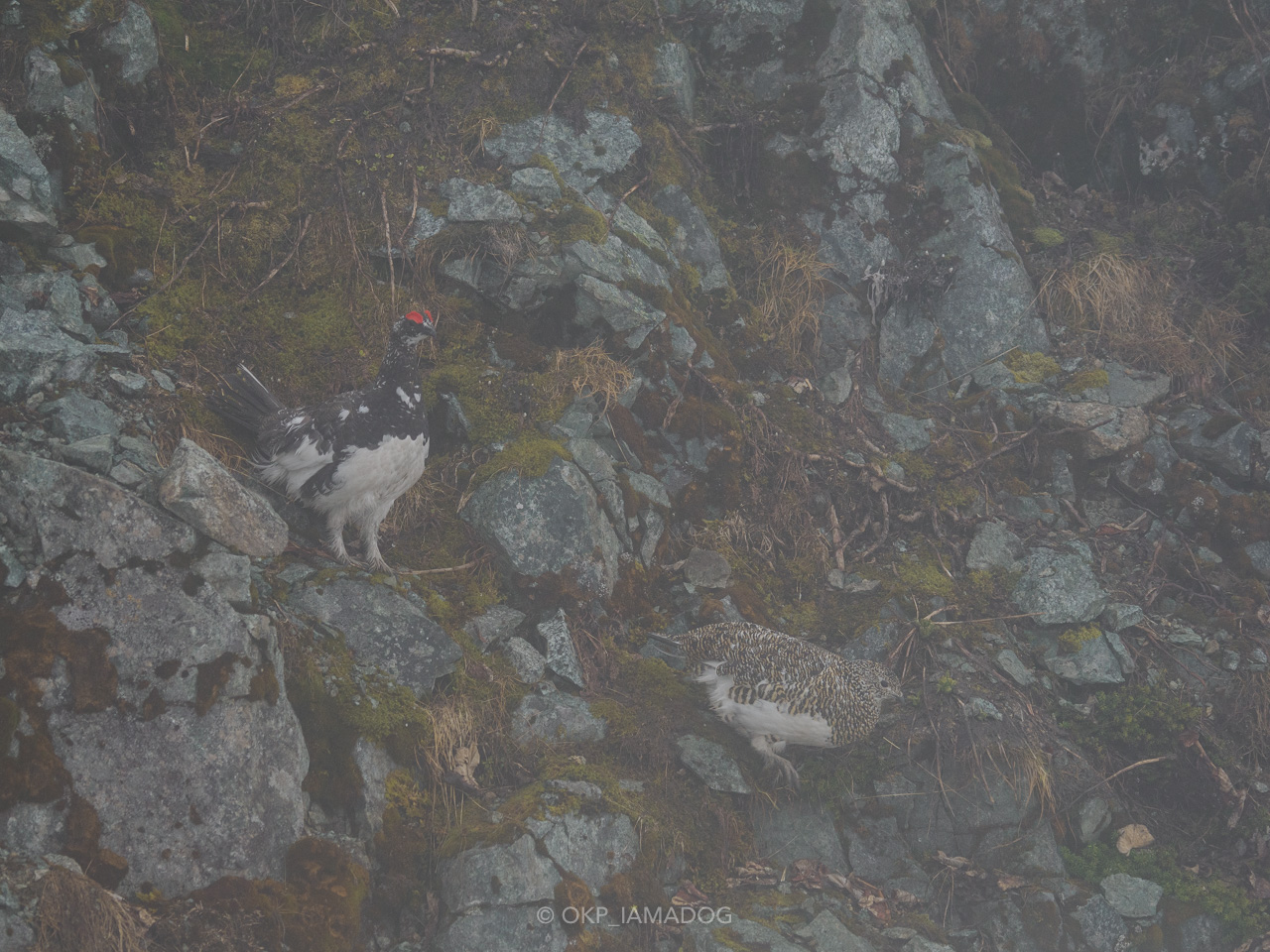 ミクリガ池の周りもライチョウだらけ。オスは何羽もいてやはりよく争っているのですが、一番いい場所にはペアになったオスがいていつも睨みを効かせている感じ?