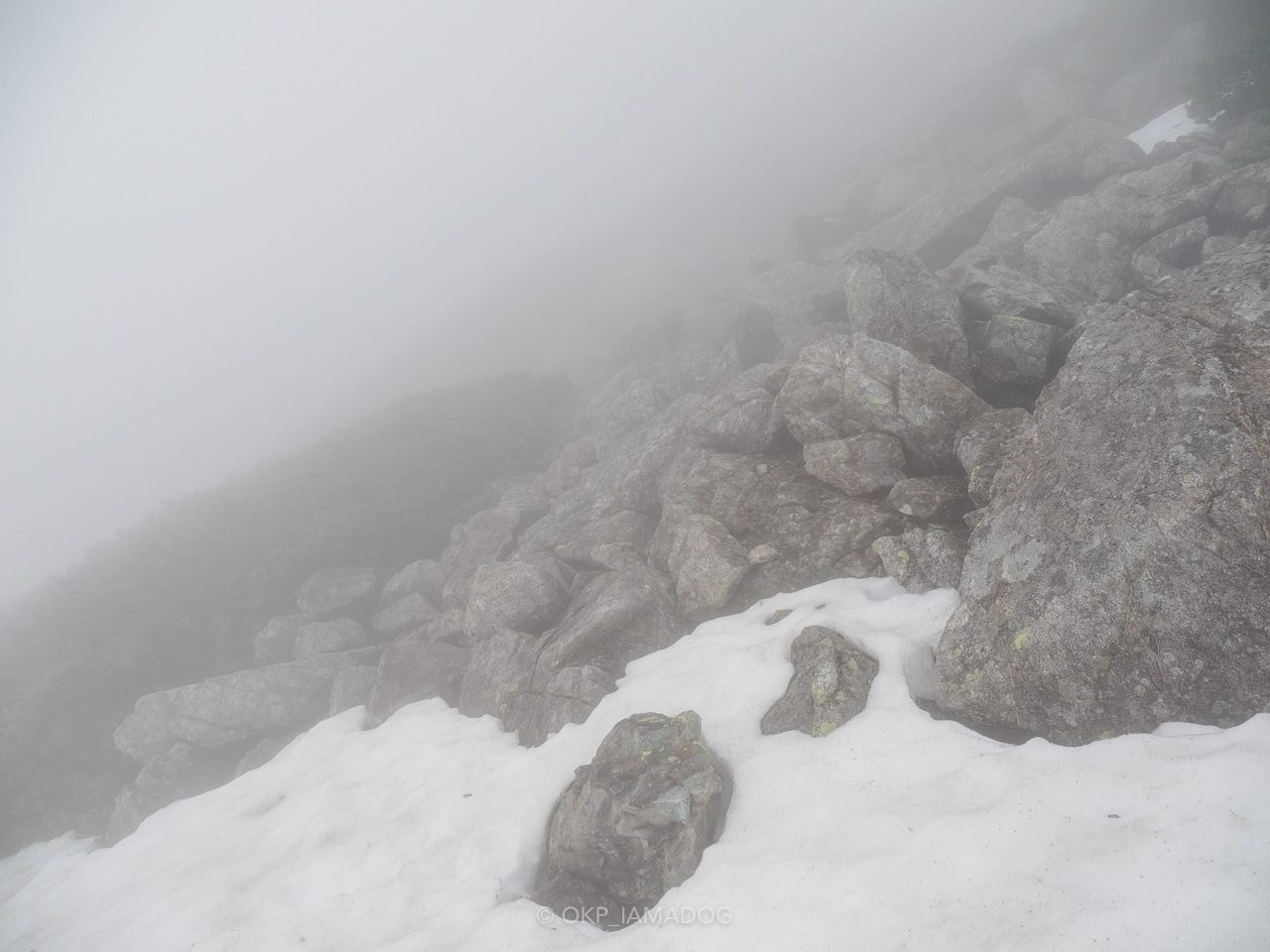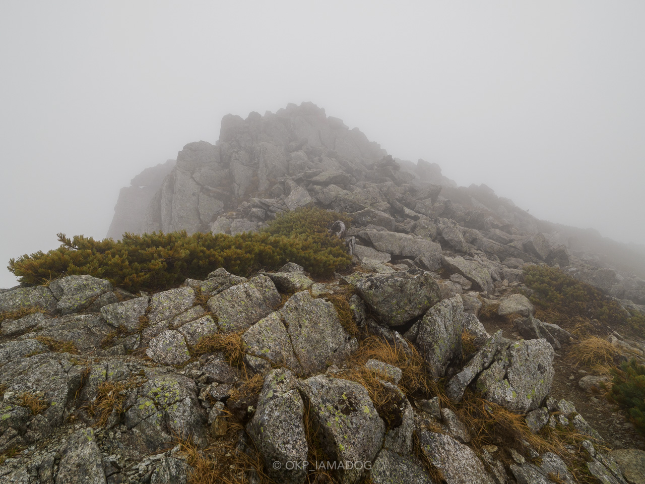 この日は視界は10mもない感じで、どちらに浄土山があるかすら怪しいレベルですが、GPSを見ながら進んで行きます。何度か登ったことがある山でなければ、この日の天気では素直に雄山に行ってたと思います。