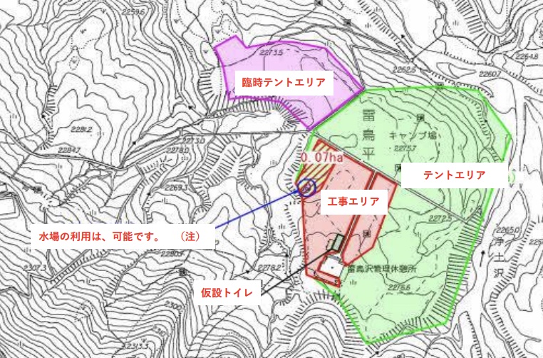 それにより、雷鳥沢キャンプ場の一部が工事規制範囲となっており、テント場の利用ができなくなっております。