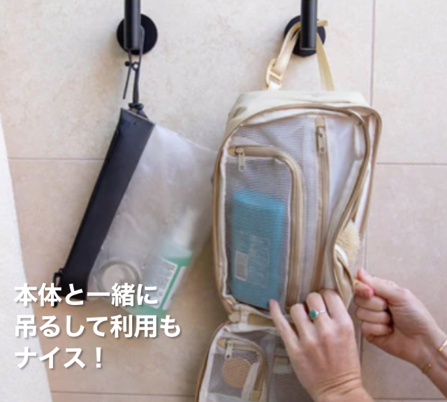 さらに3モデルともU字のジッパーでパカッと開くようになっていて、SLIMとPLUSは縦方向、MAXは横方向に開いた状態で、吊るす収納も可能です。これはトラベルポーチでは比較的お馴染みの仕様かと思われます。